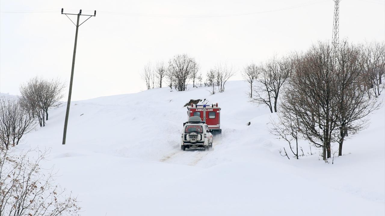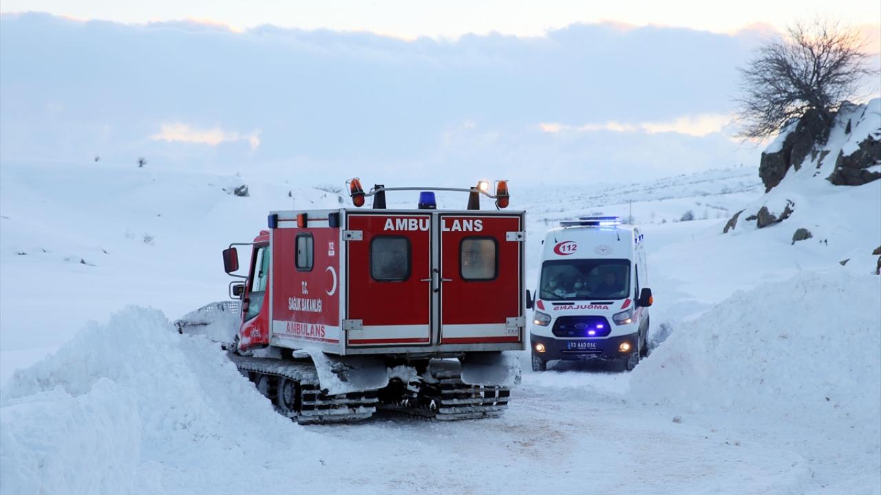 Hastalara en kısa zamanda ulaşmak için, kardan dolayı 10 kilometrelik kısmı kapalı olan yolun açılmasını beklemeyen sağlık ekipleri, paletli ambulansla karlı yolu aşarak köye ulaştı.