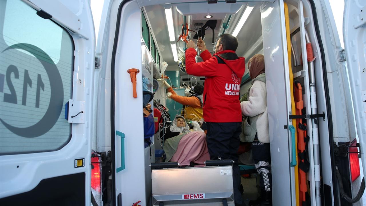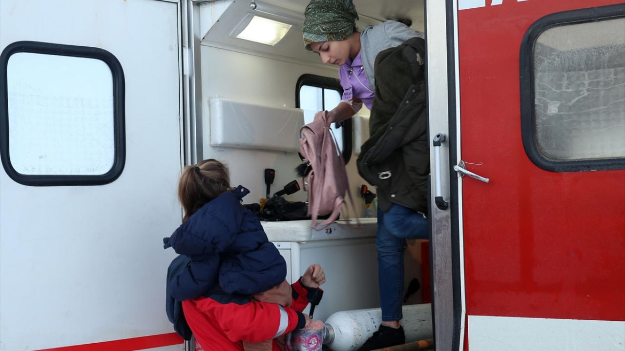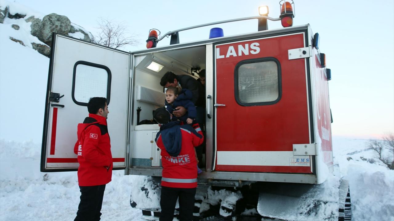 Anne ve çocuklarına ilk müdahaleyi evde yapan sağlık çalışanları, yolun açılması üzerine paletli ambulansa aldıkları hastaları Koyunlu köyü yakınlarında bekleyen ambulanslara teslim etti.