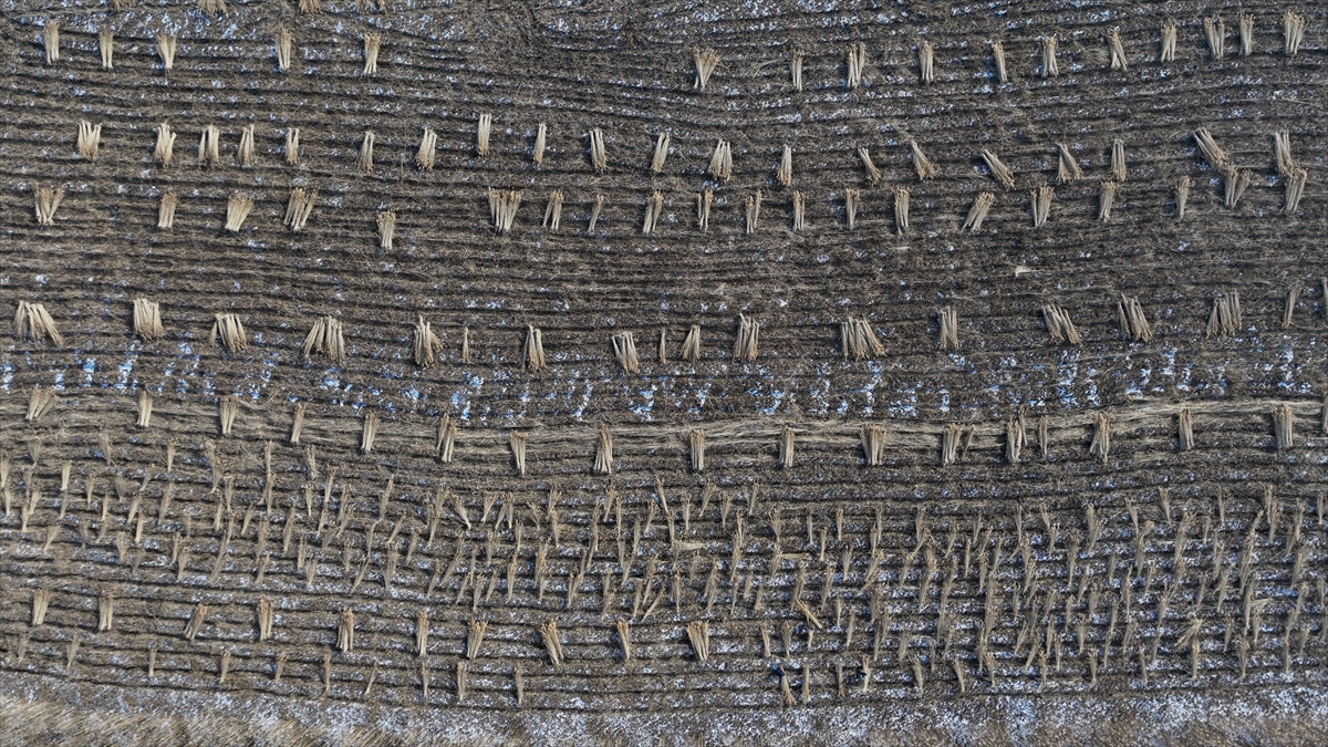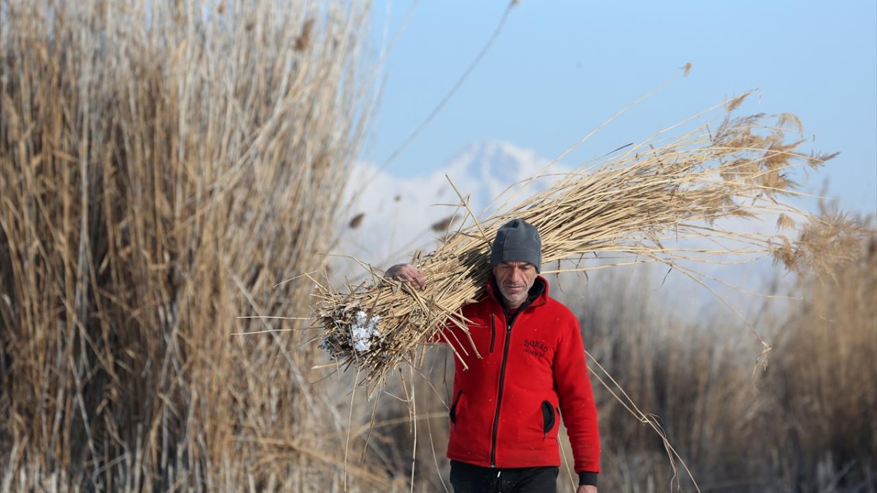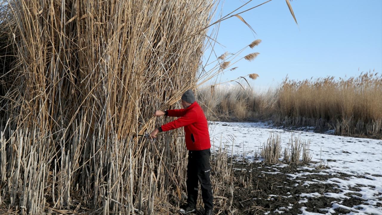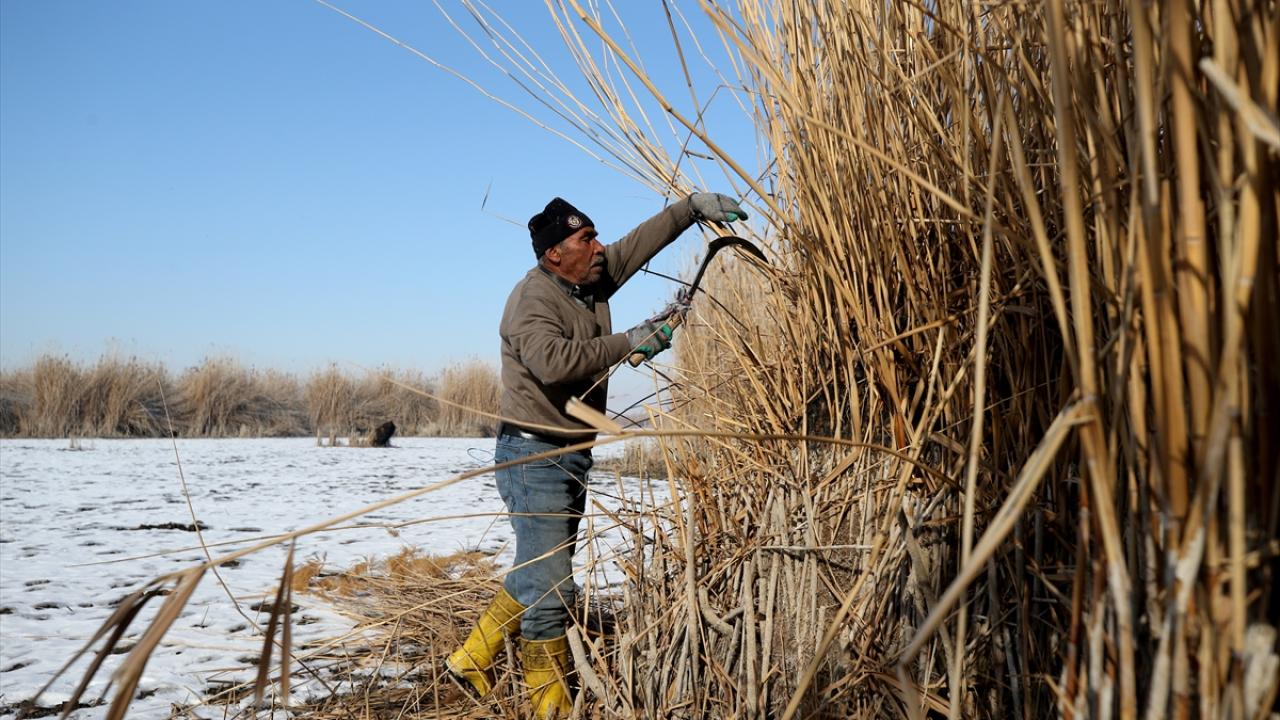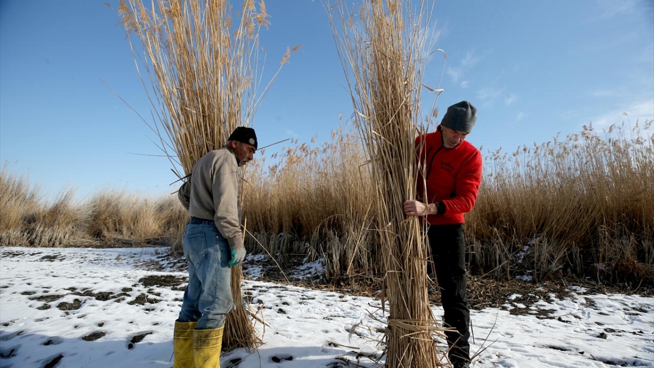 Türkiye'nin önemli sulak alanlarından Sultan Sazlığı Milli Parkı'nda yetişen kamışlar, soğuk havaya rağmen bölgede yaşayanlar tarafından hasat ediliyor.