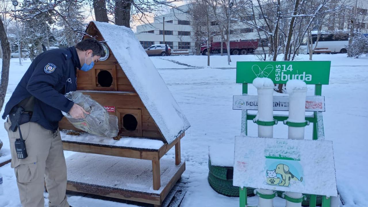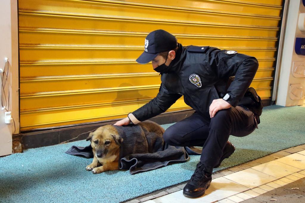 Hayvanlar için beslenme bölgelerine mama ve yiyecek bırakan polislerden bazılarının sokakta üşüyen köpeklerin üzerini battaniye ile örttüğü anlar fotoğraf karelerine yansıdı.