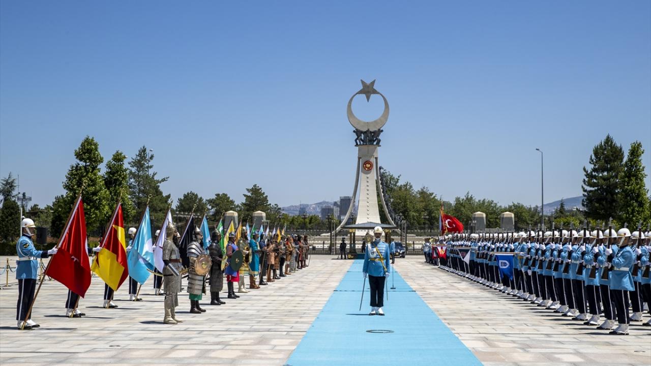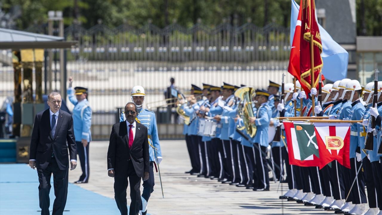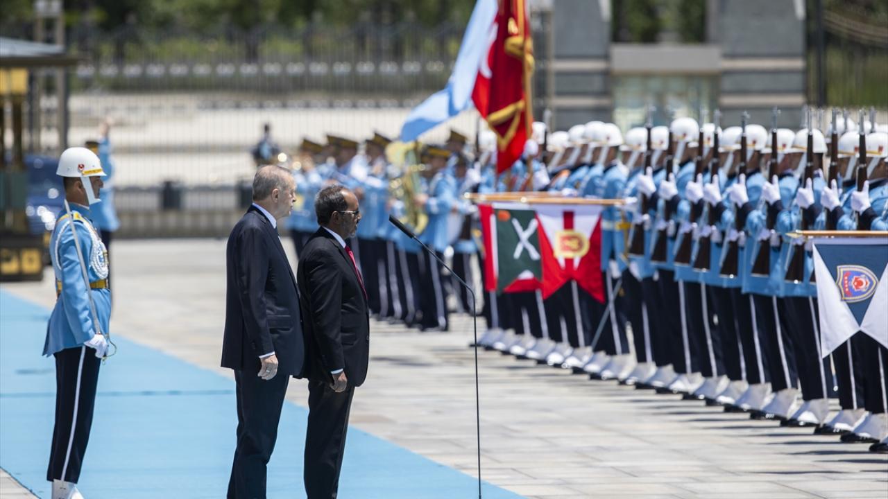 Cumhurbaşkanı Erdoğan ve Somali Cumhurbaşkanı Mahmud`un tören alanındaki yerlerini almalarının ardından 21 pare top atışı eşliğinde iki ülke milli marşları çalındı. Mahmud, Muhafız Alayı Tören Kıtası`nı "Merhaba asker" diyerek selamladı.