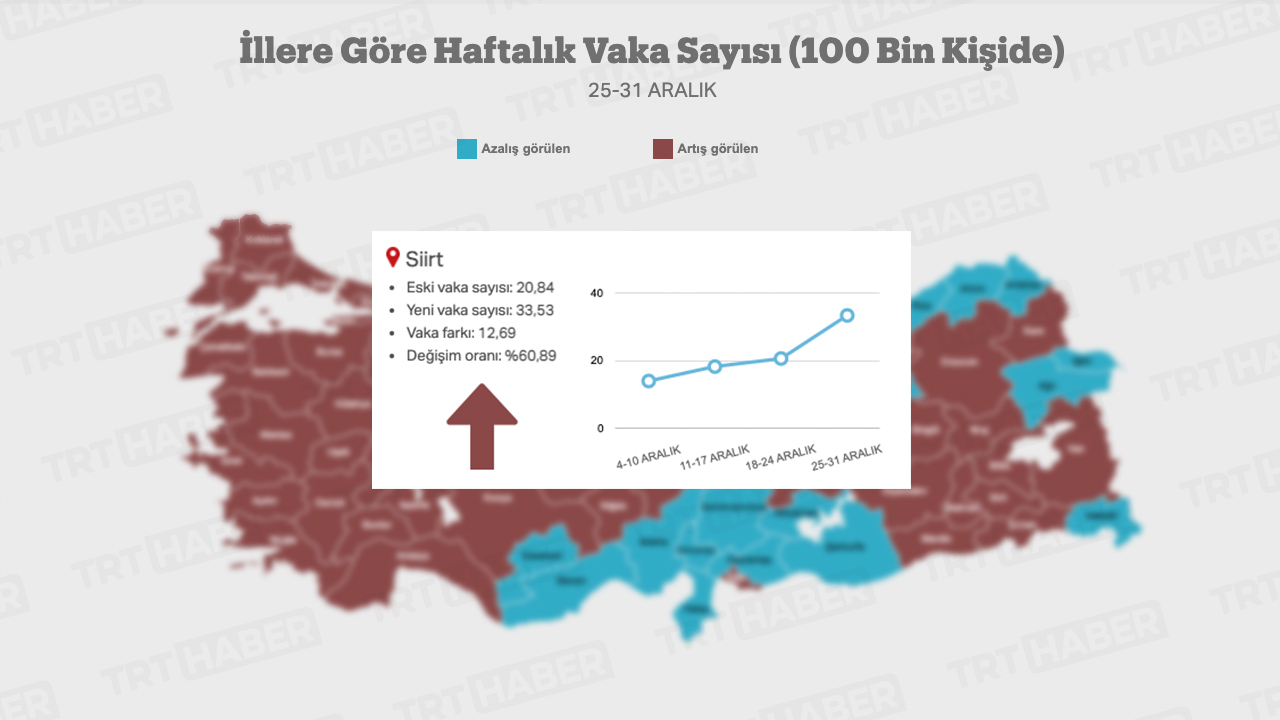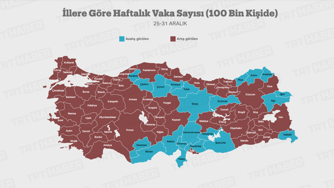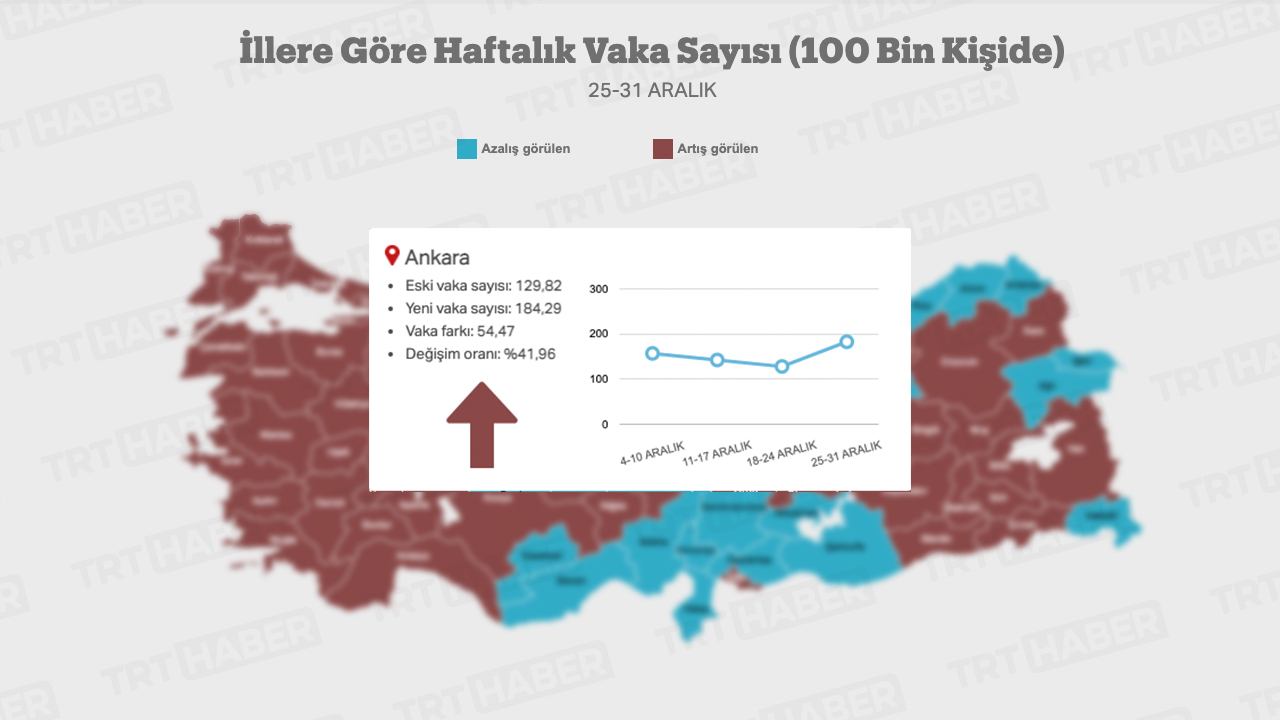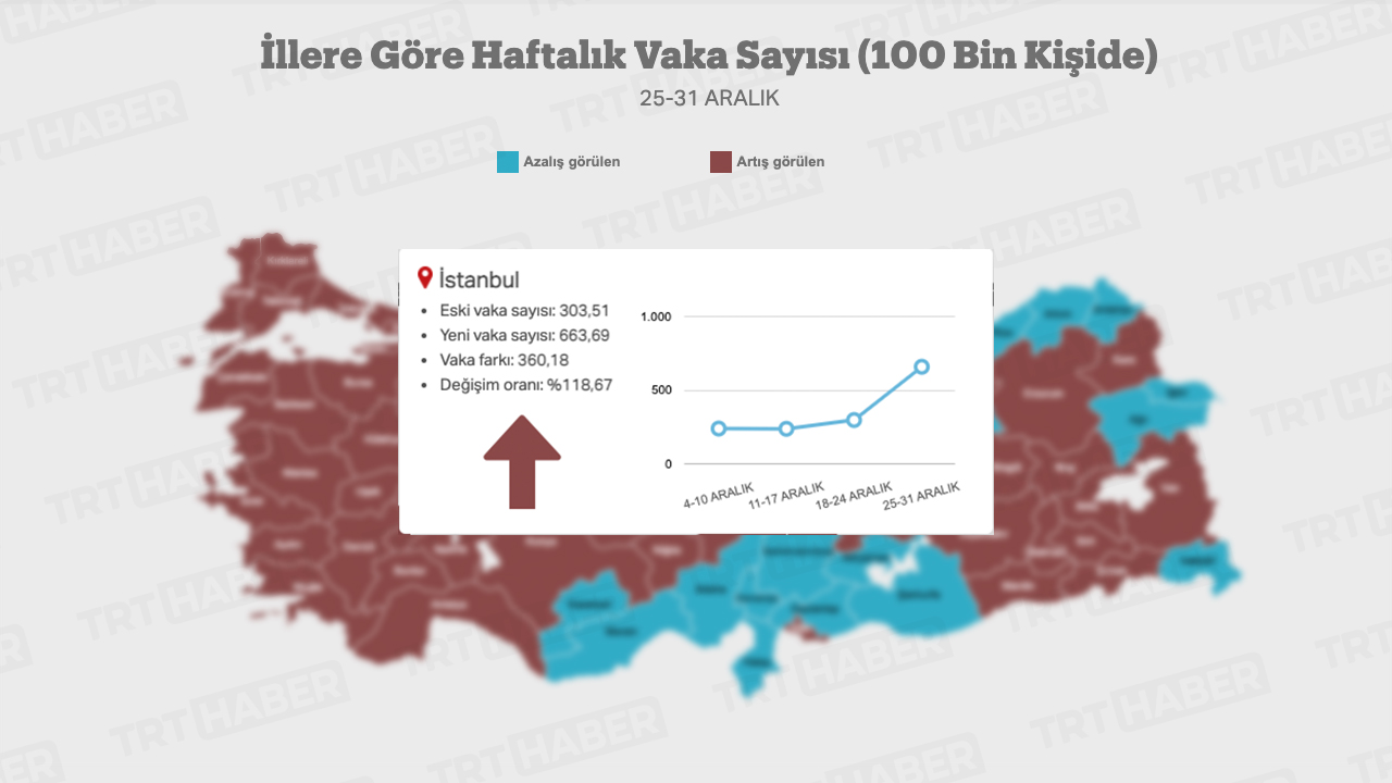 Sağlık Bakanı Fahrettin Koca, 25-31 Aralık tarihleri arasında illere göre her 100 binde görülen haftalık koronavirüs vaka haritasını açıkladı. İllere göre vaka sayısı her 100 bin kişide İstanbul'da 663,69, Ankara'da 184,29, İzmir'de 323,30 oldu. İşte son bir haftada vaka sayısı en çok artan 15 il...