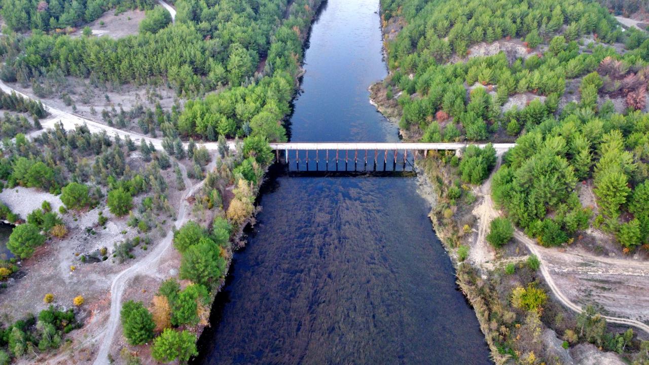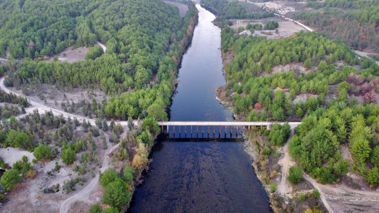 Sonbaharla birlikte mavi, yeşil ve sarıya bürünen nehir çevresi, drone ile görüntülendi.