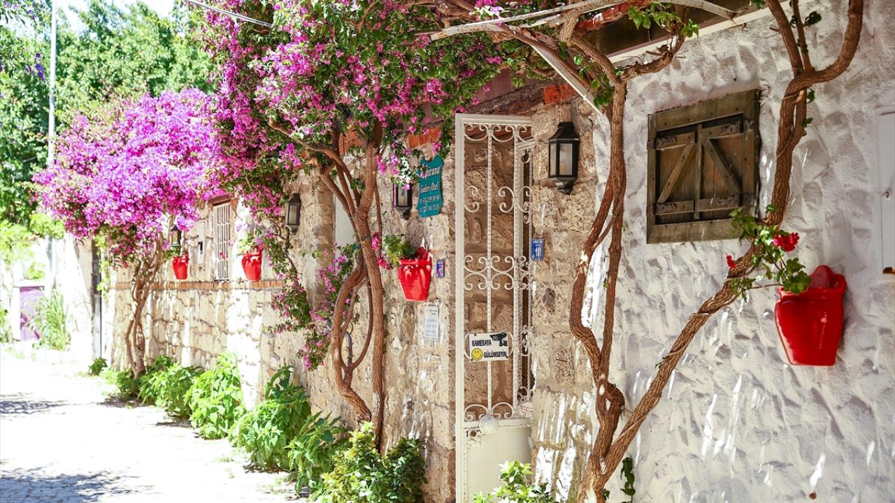 Taş binalardan sarkan kırmızı, mor ve beyaz begonviller ise evlerin renkli örtüsü gibi duruyor.