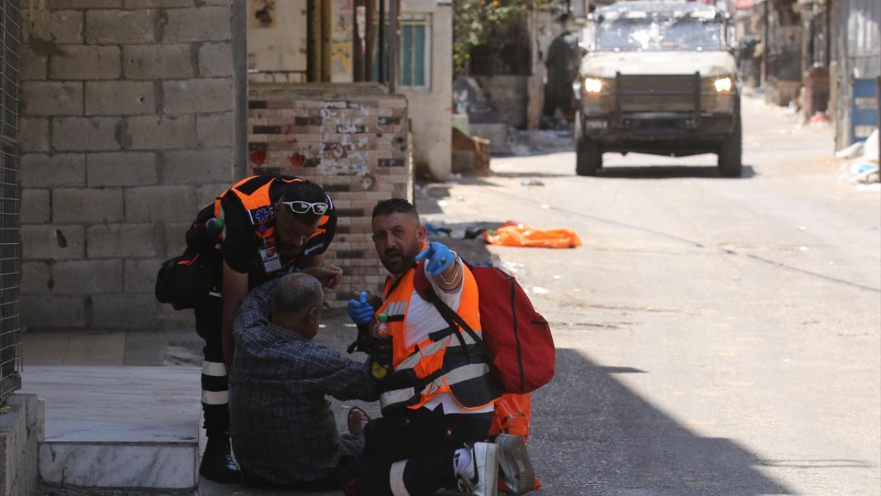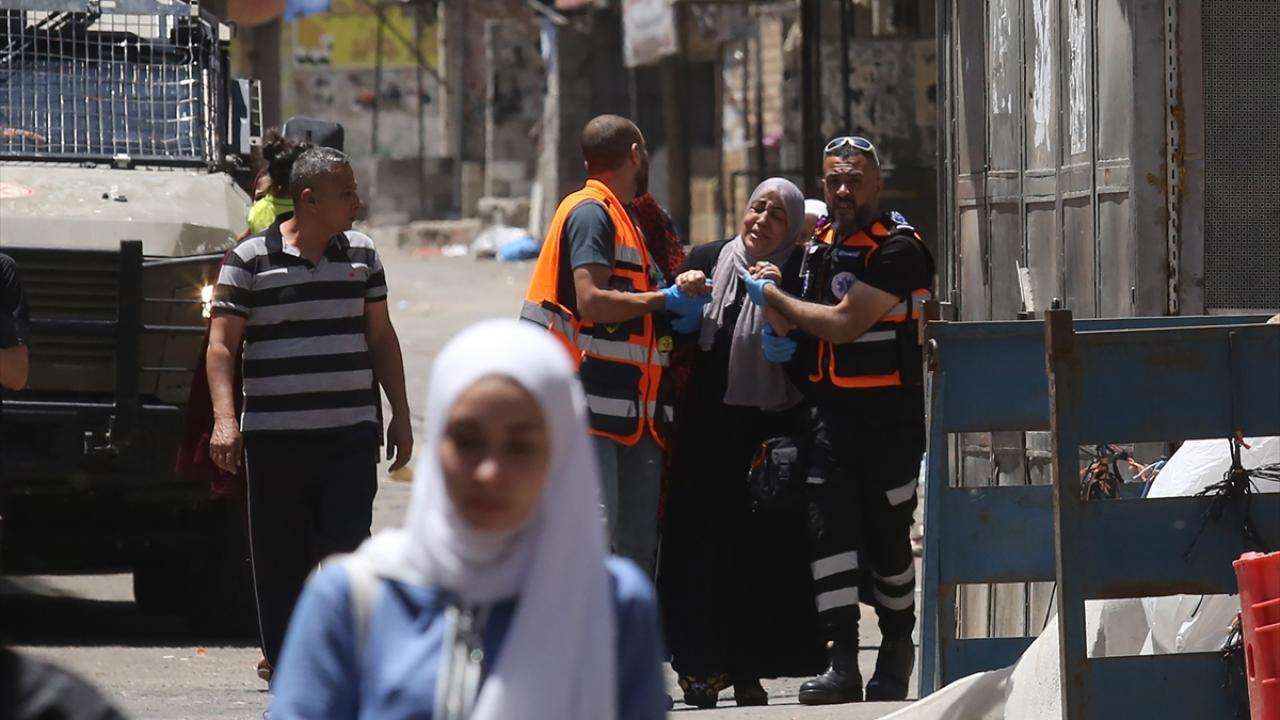 Bölgeden ayrılırken düşen bir Filistinliye, sağlık ekipleri yardım etti.