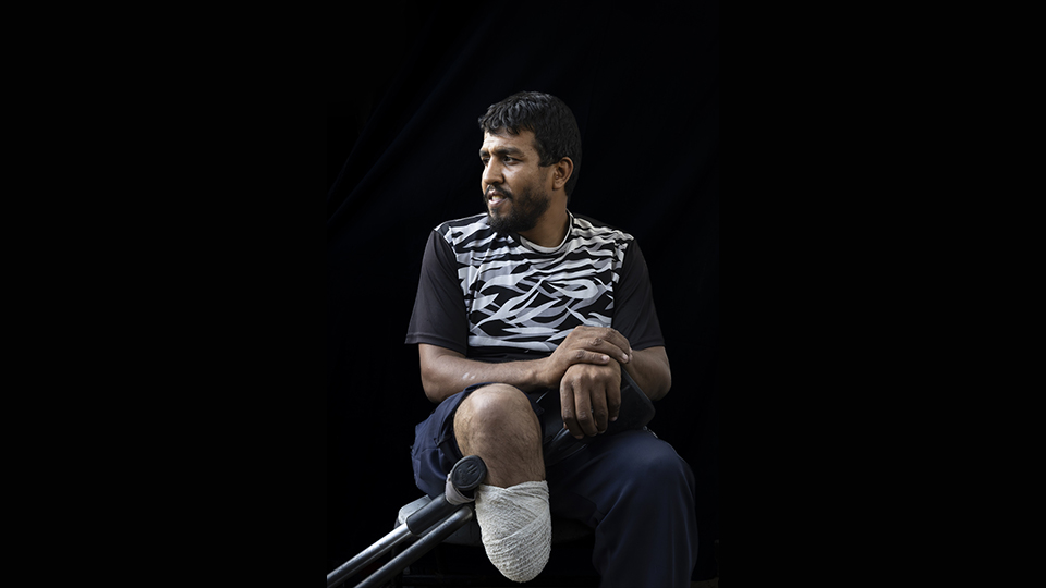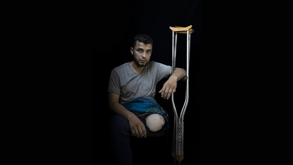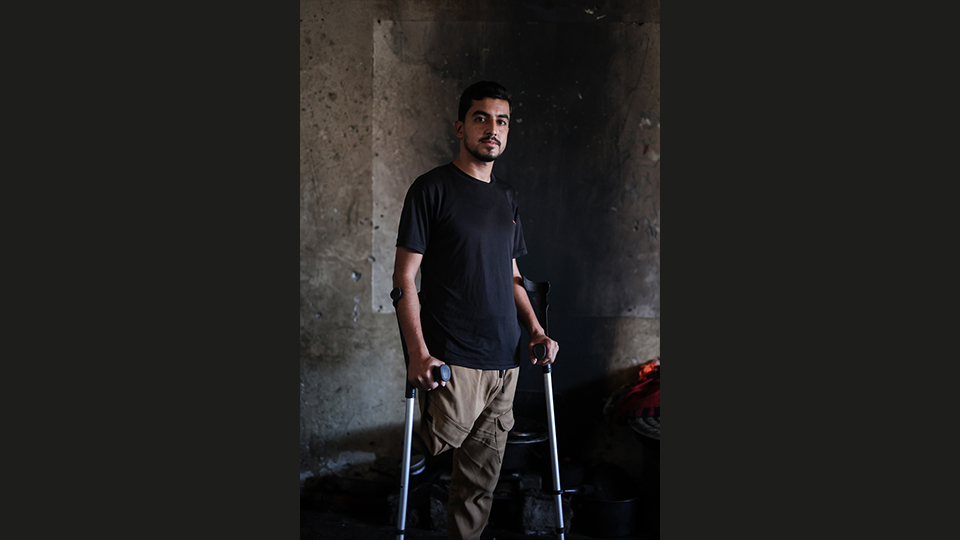 22 yaşındaki Filistinli Mahmoud Sallout, Han Yunus`tan göç ederken maruz kaldığı hava saldırısı sonucu bacağını kaybetti ve vücuduna şarapnel parçaları isabet etti.