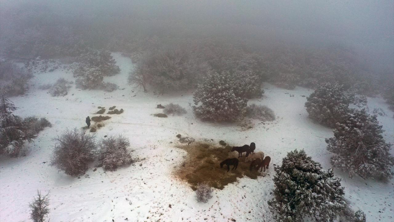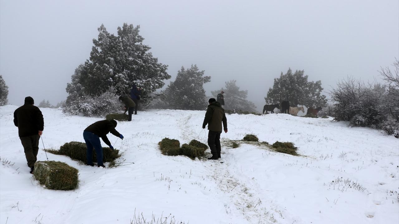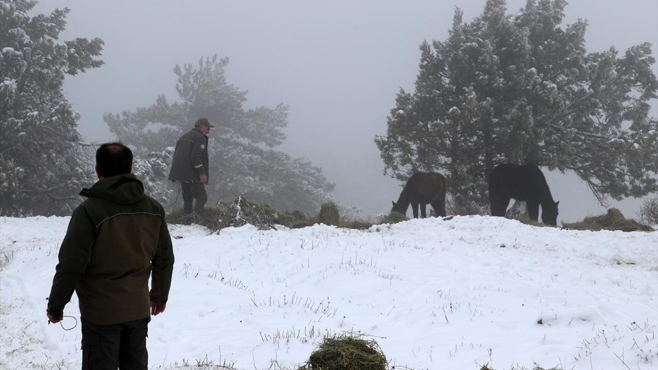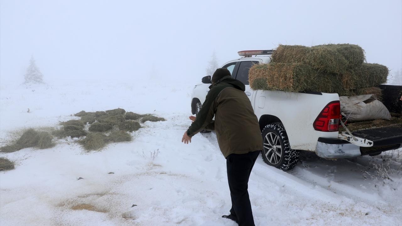 Manisa'nın yüksek kesimlerinde etkili olan kar yağışı sonrası beyaza bürünen Spil Dağı Milli Parkı'nda yiyecek bulmakta zorlanan yaban hayvanlarına yem bırakıldı.