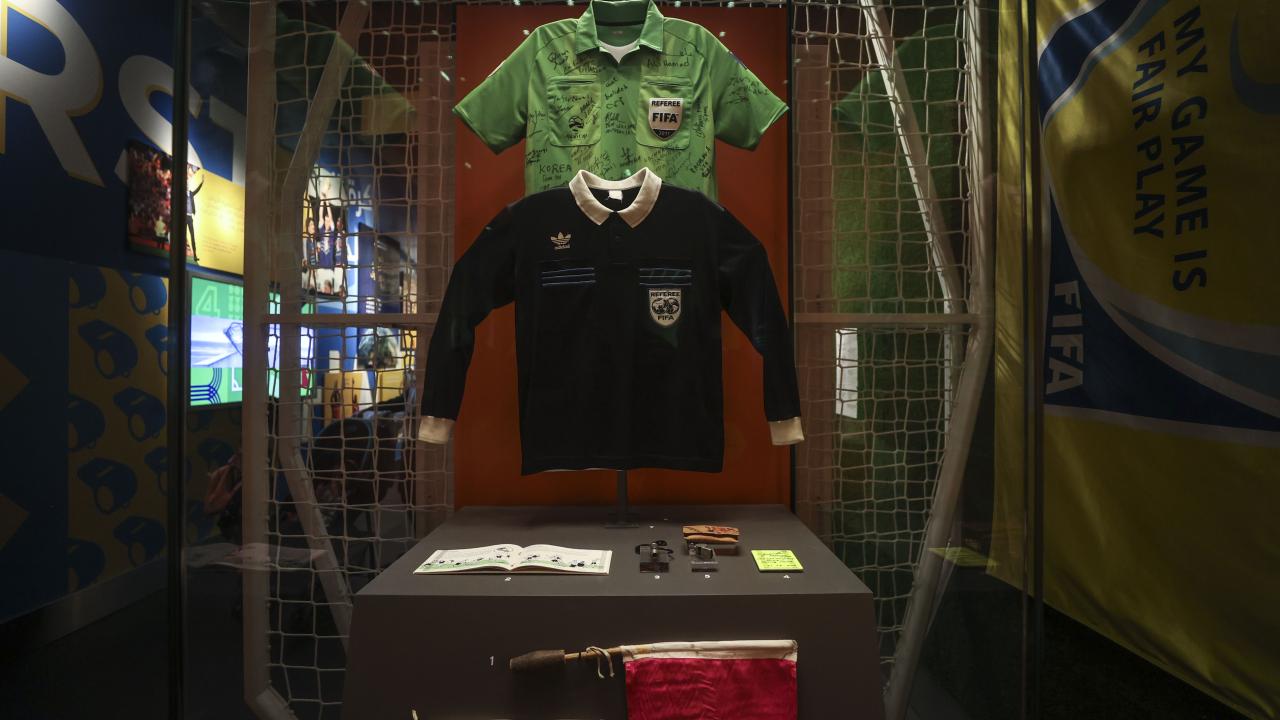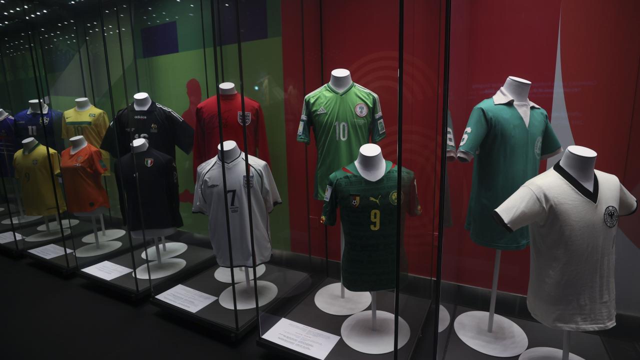 1930 yılında Uruguay`da düzenlenen Dünya Kupası`nın grup maçlarında kullanılan topun ziyaretçileri karşıladığı serginin en dikkat çekici objelerinden biri, iki yıl önce hayatını kaybeden Arjantinli efsane futbolcu Diego Armando Maradona`nın 1986 Dünya Kupası çeyrek finalinde İngiltere`ye iki gol attığı maçta giydiği forma.