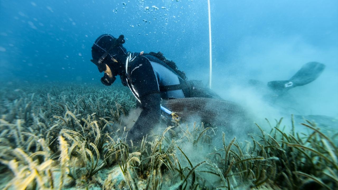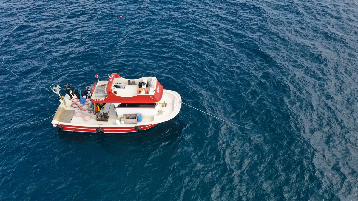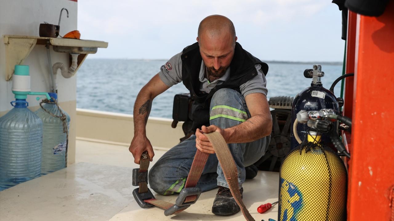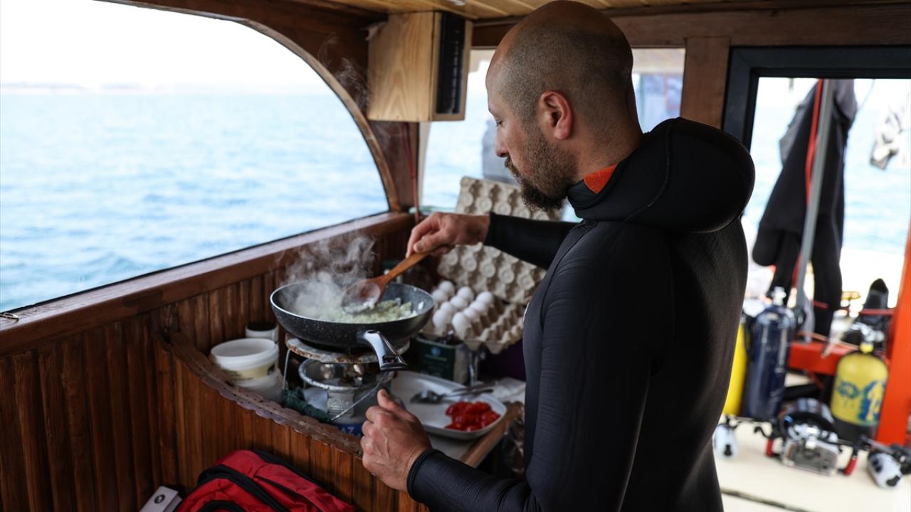 Günün ilk ışıklarıyla açıldıkları denizde kahvaltılarını yaptıktan sonra hazırlık yapan dalgıçlar, hava makinesine bağladıkları 150 metre uzunluğundaki özel hortumlarla 35 metreye dalış yapıyor.