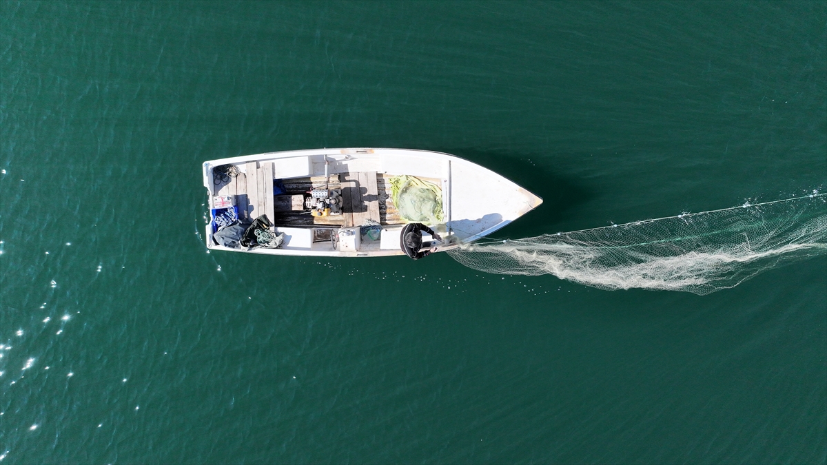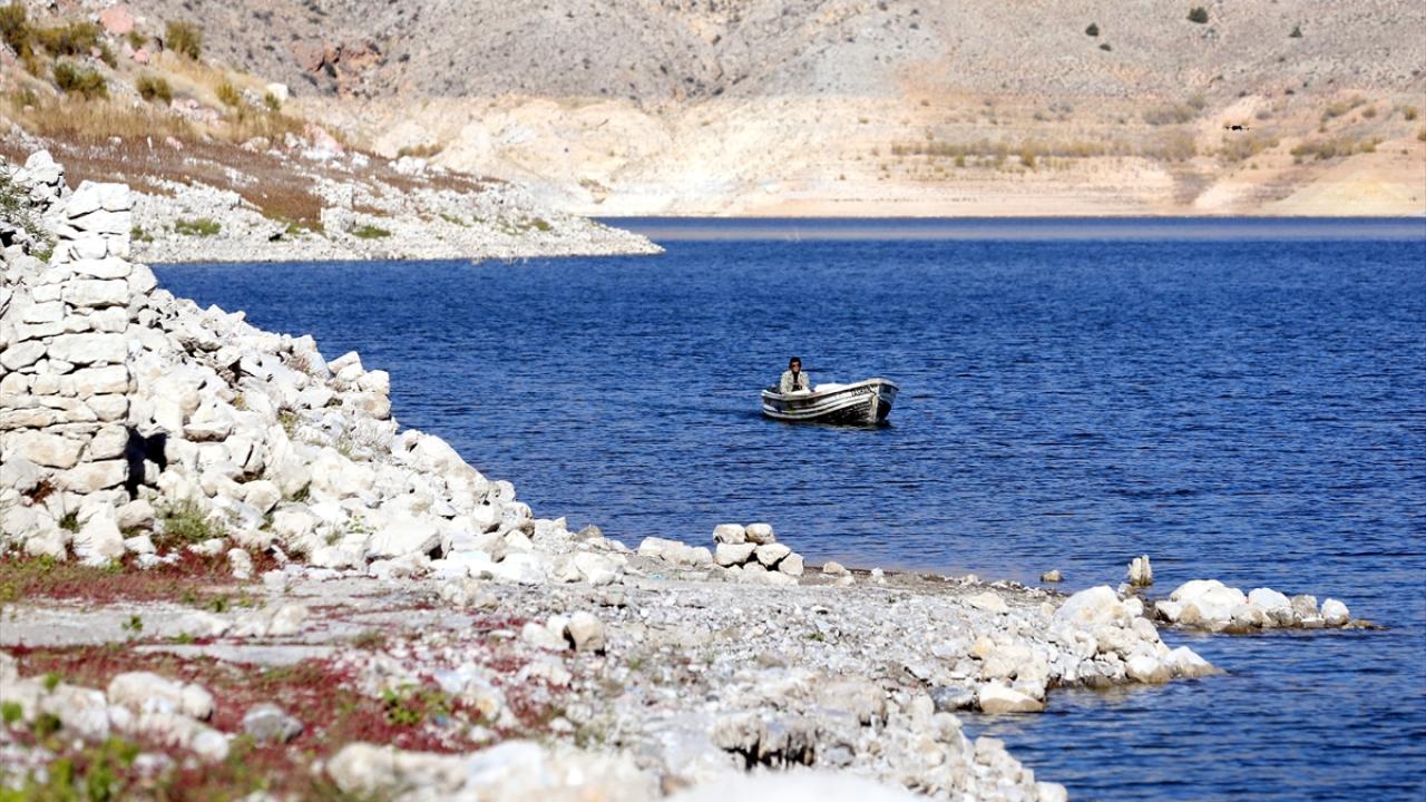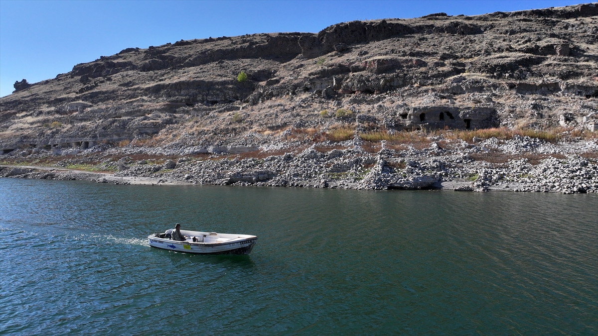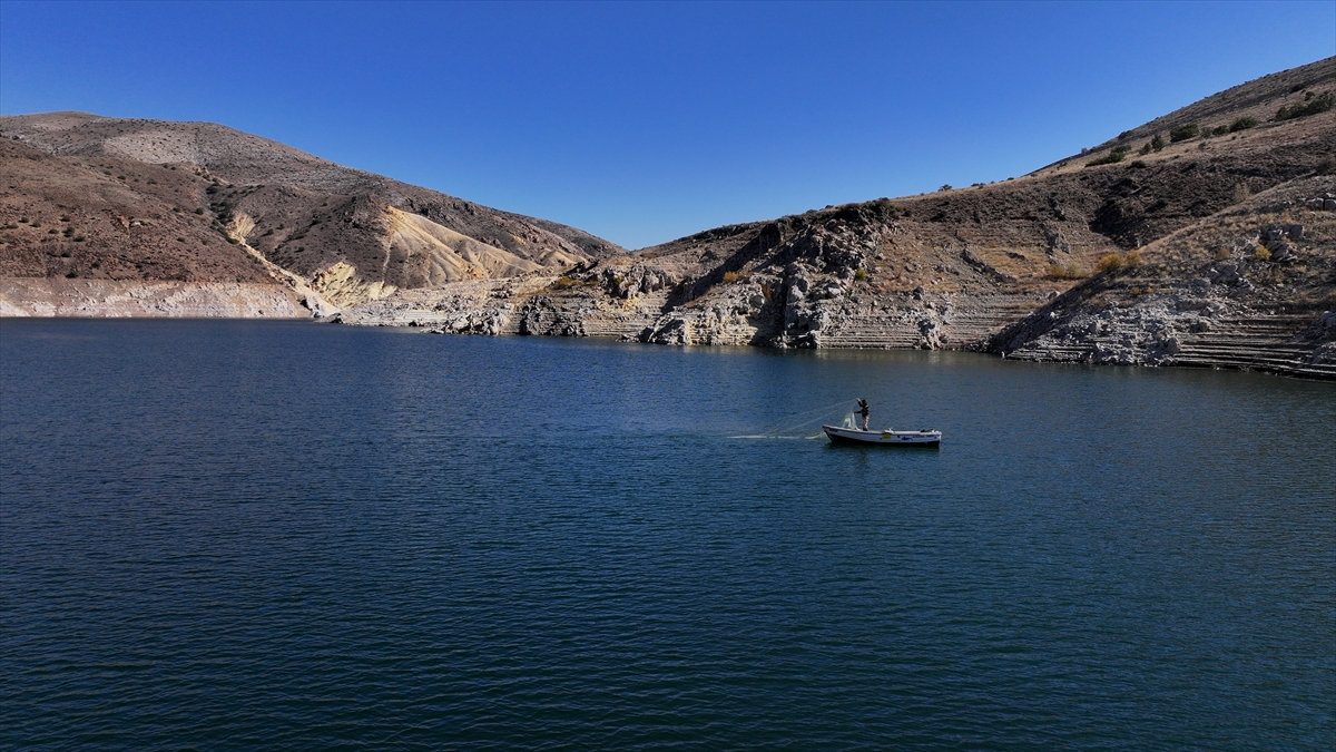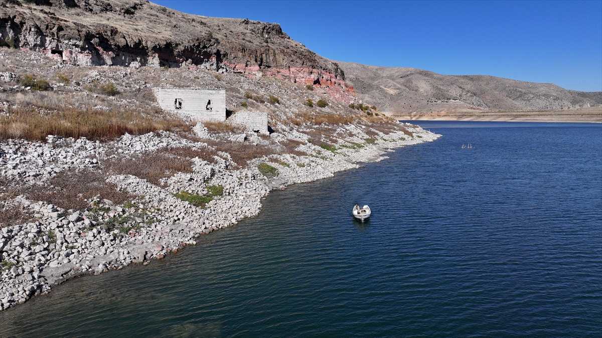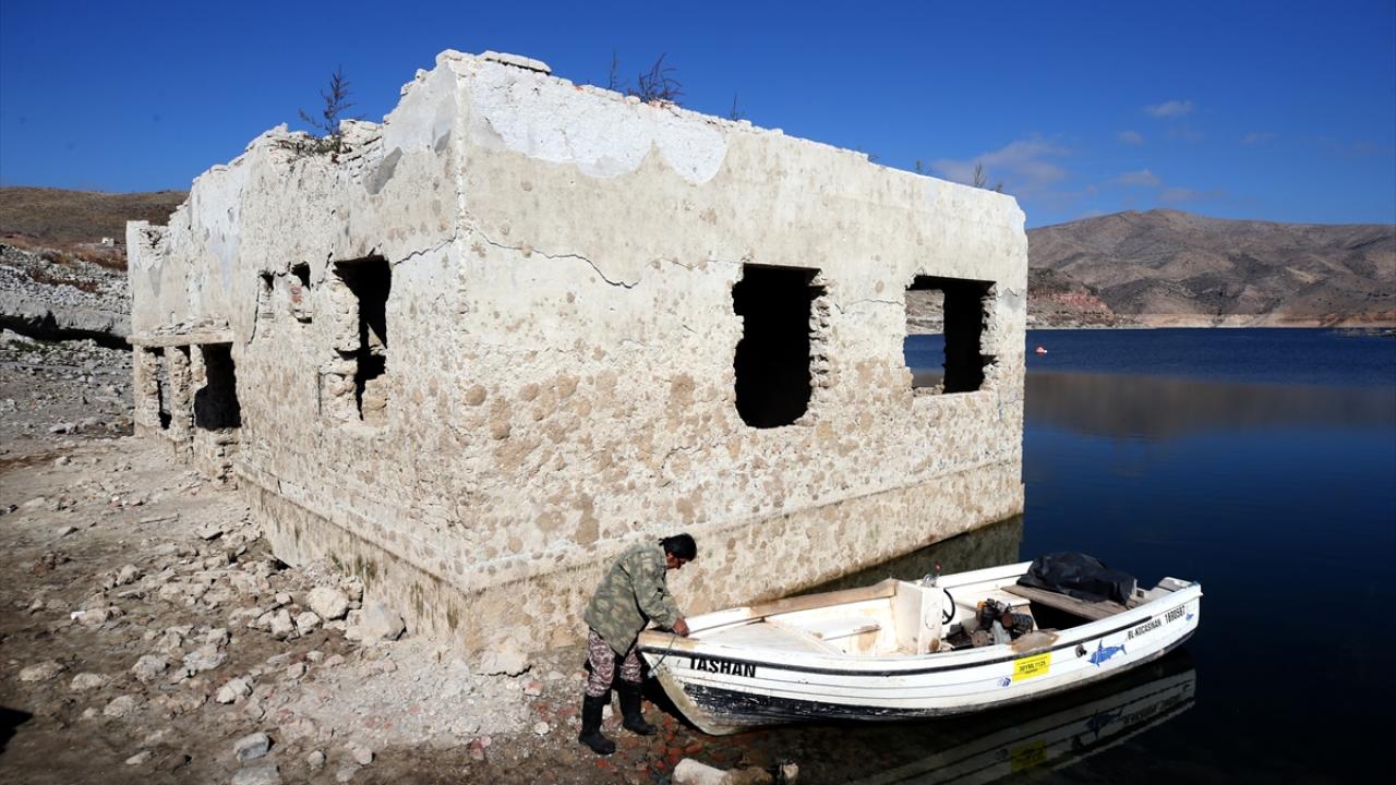 Sabahın ilk ışıklarıyla baraj gölüne açılan Taşhan, kuraklığın etkisiyle ortaya çıkan eski mahallesindeki yapıların yanından tekneyle geçerek ağlarını suya atıyor.