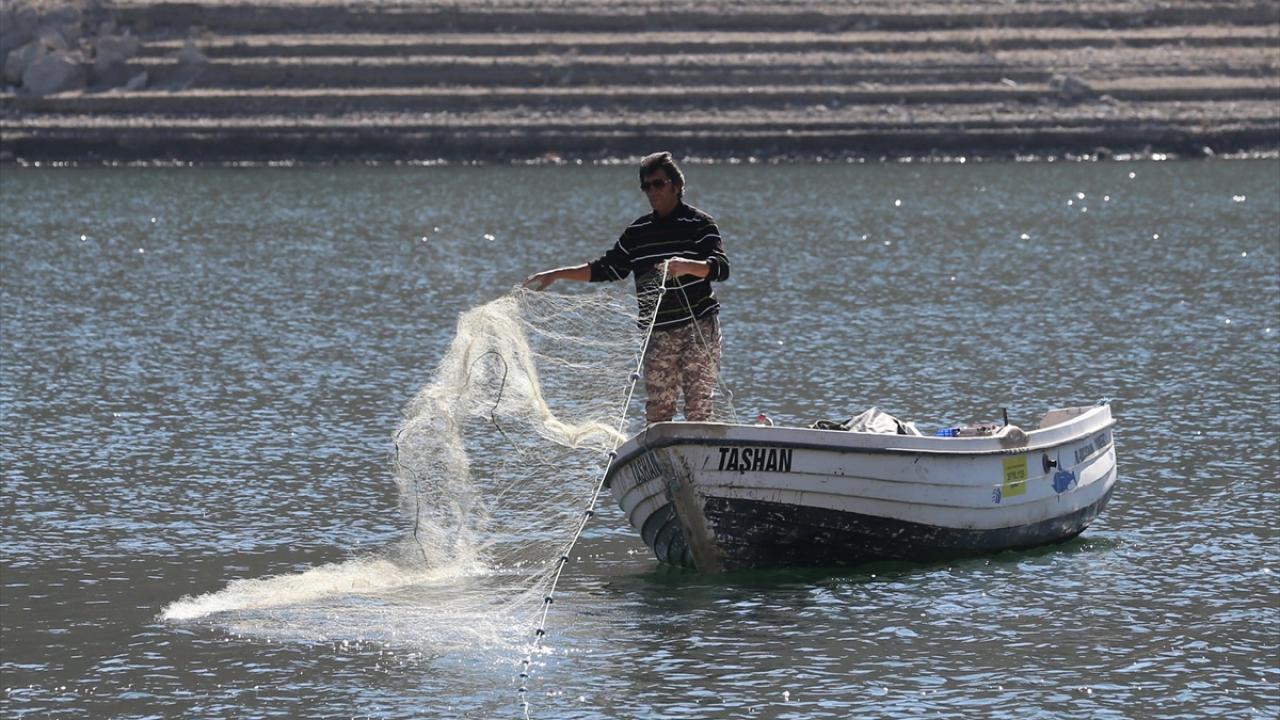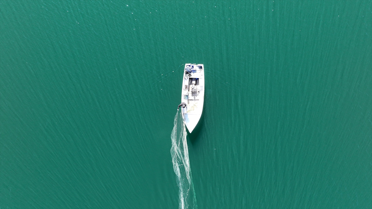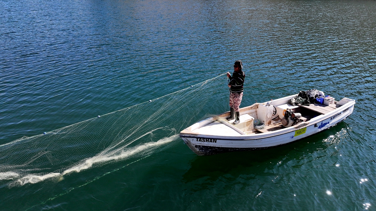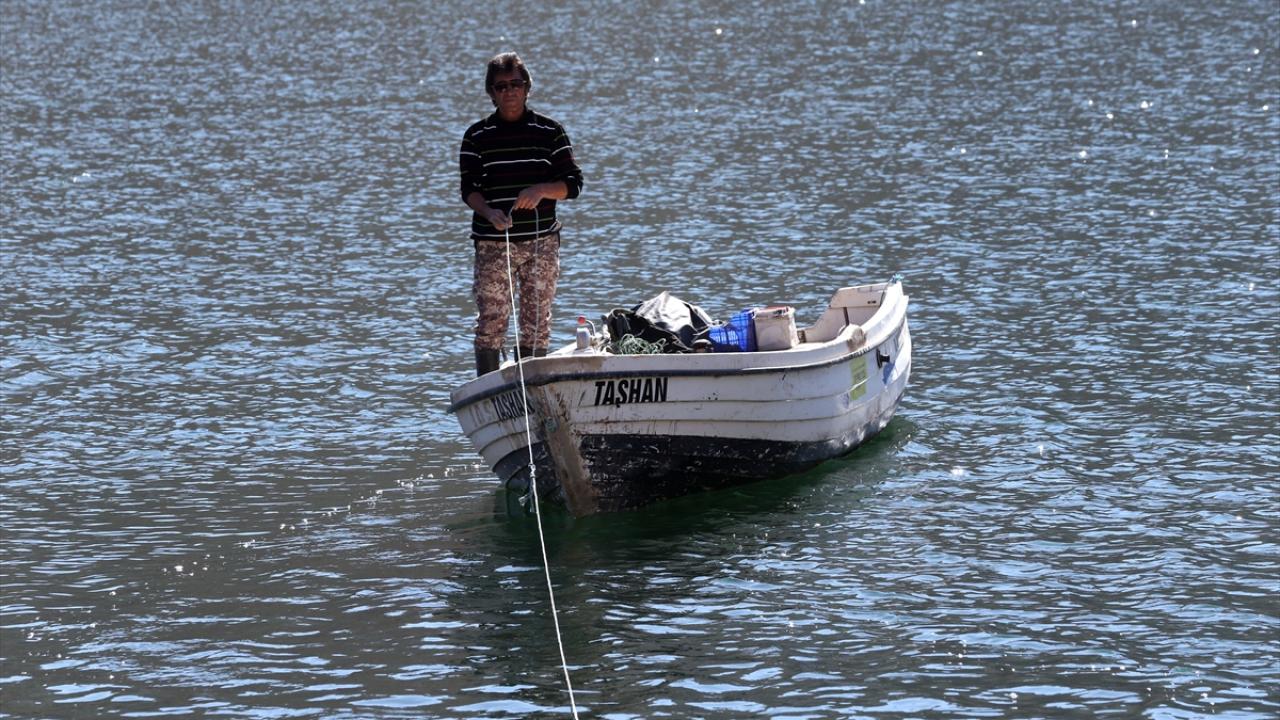 Ağına takıan balıkları toplamak için ertesi gün erken saatlerde teknesiyle yeniden göle açılan Taşhan, yakaladığı balıkları Yamula Su Ürünleri Kooperatifine satıyor.