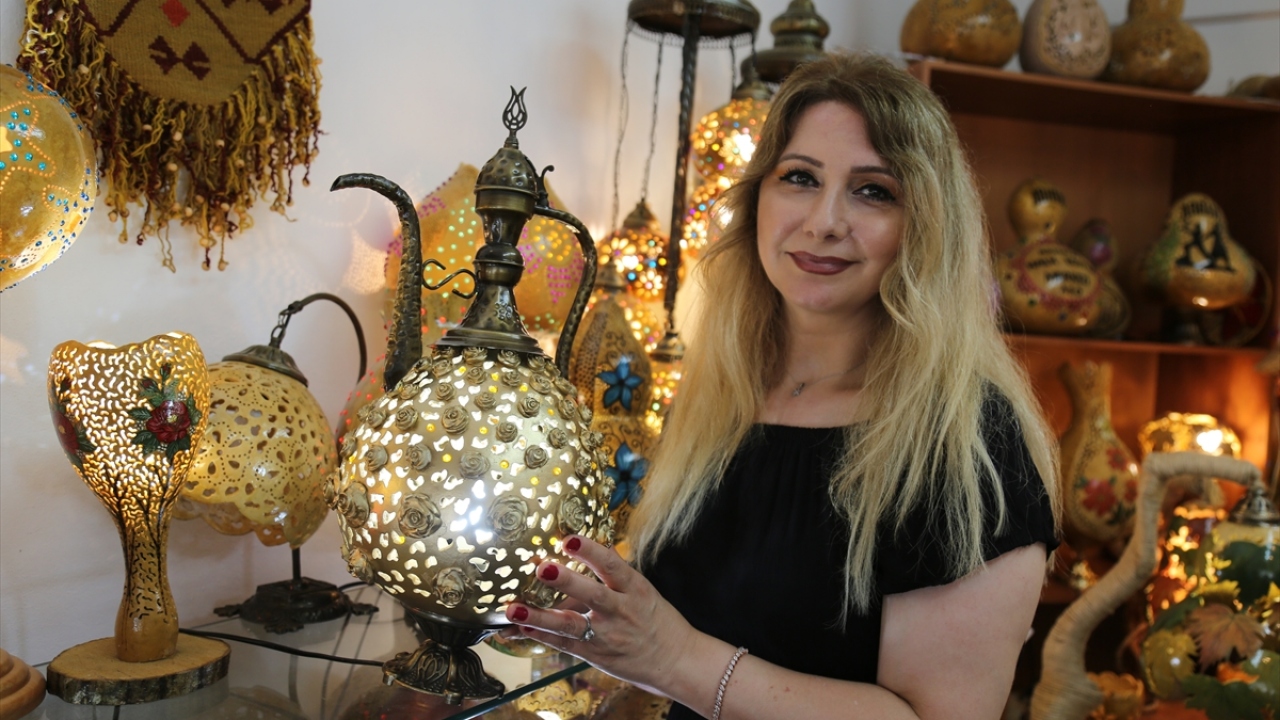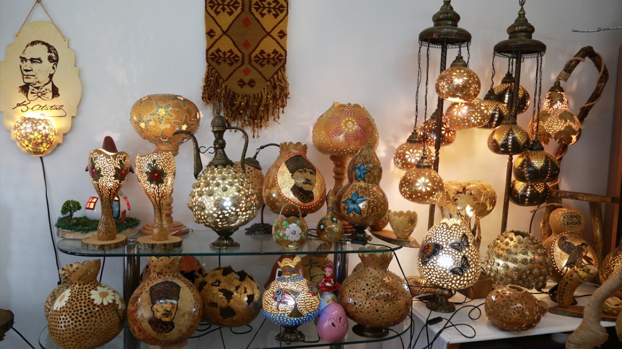 "İlk zamanlarda ahşap yakma tekniğiyle hediyelik eşya üretiyordum. Daha sonra su kabağını işleyerek hediyelik eşya üretimine başladık. Dünyayı etkisi altına alan koronavirüs nedeniyle devletimizin `Evde kal` çağrısına uydum ve yaklaşık 5 aydır zamanımı atölyemde su kabağından süs eşyaları yaparak geçirmeye başladım."
