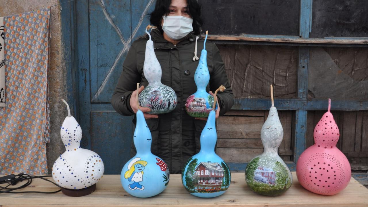Kastamonu'nun İnebolu ilçesinde yaşayan ev hanımı 54 yaşındaki Nurhayat Aksakal, su kabaklarını boyayarak dekoratif süs eşyalarına dönüştürüyor.