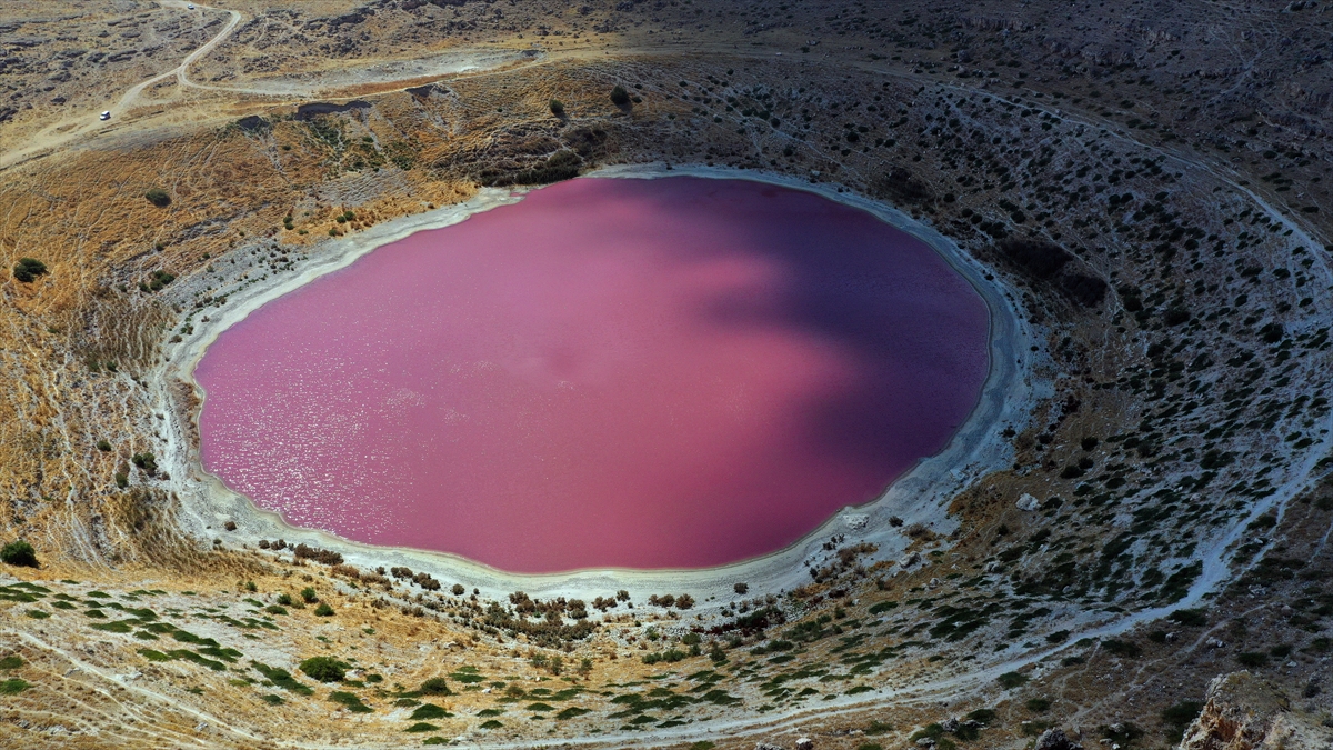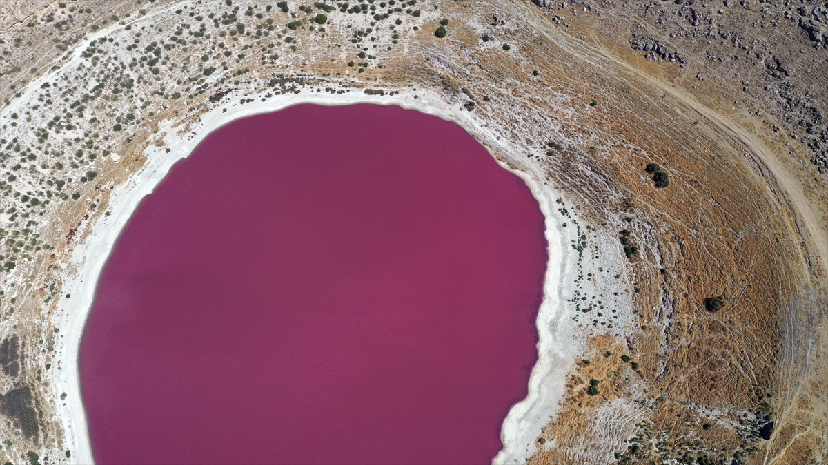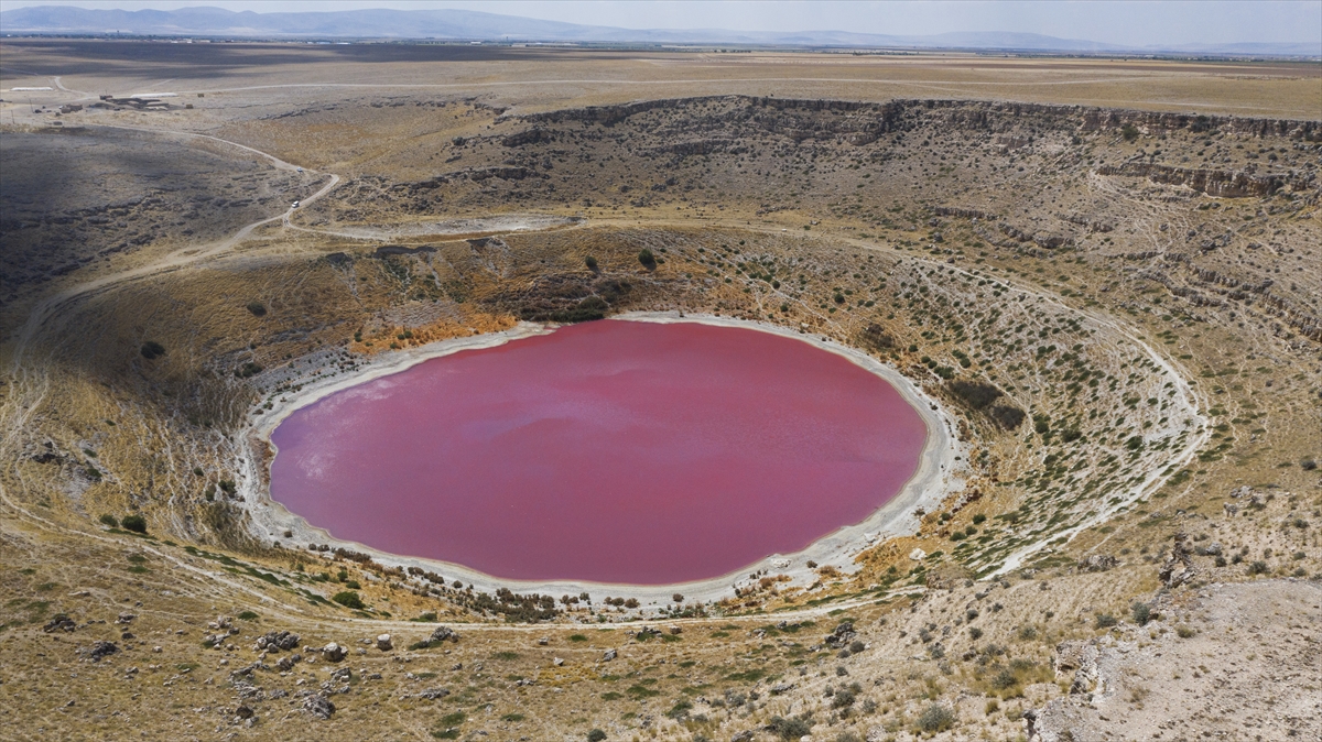 Konya'nın Karapınar ilçesinde bulunan, hava sıcaklıkları ve jeolojik faktörler dolayısıyla rengi pembeye dönen Meyil Obruğu Gölü, görenleri şaşırtıyor.