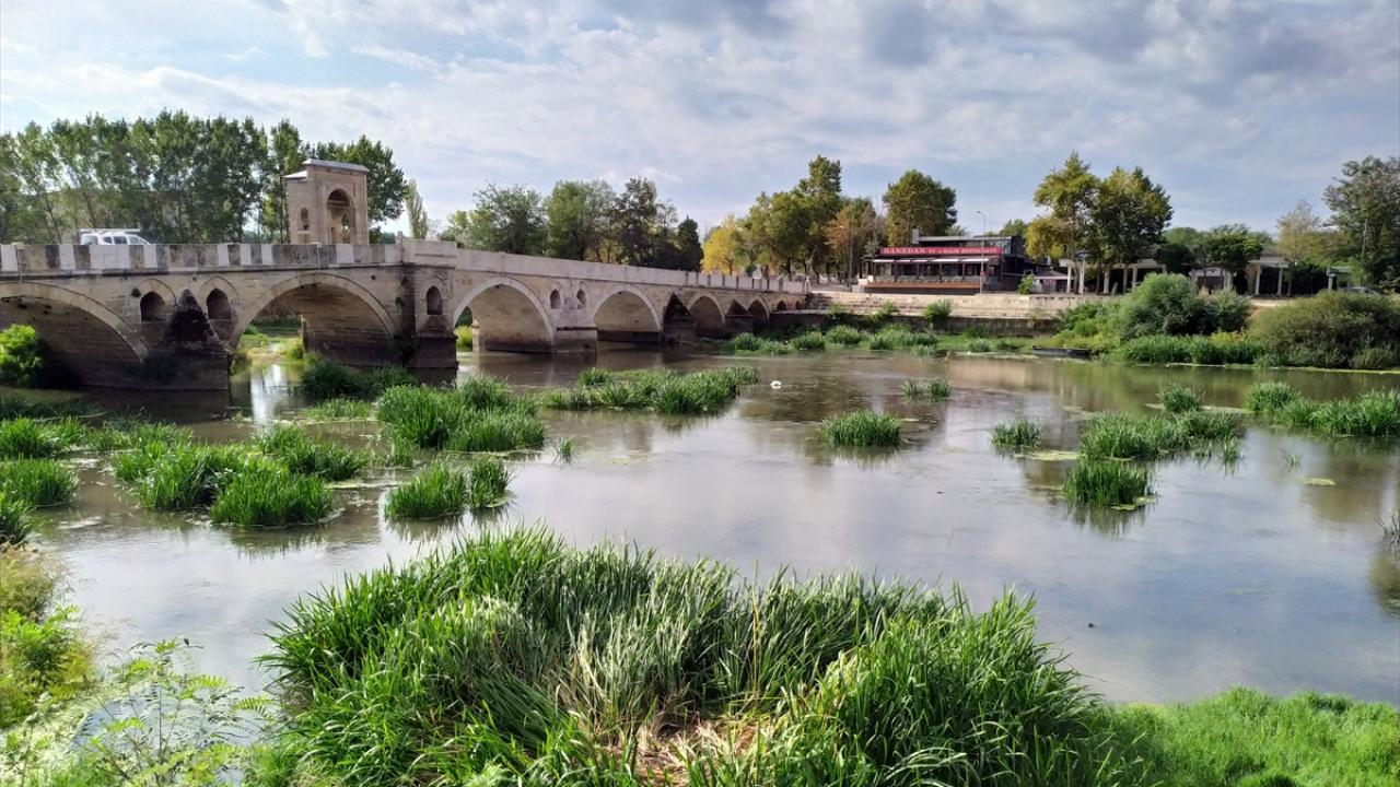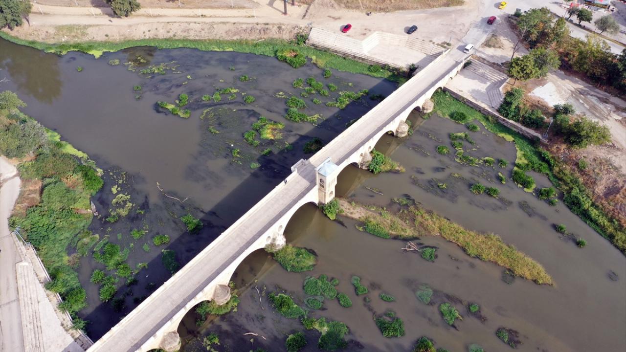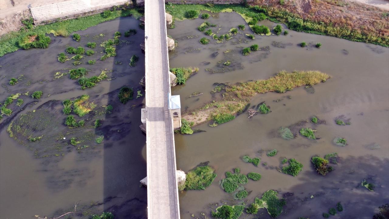 Nehirdeki kuraklığın en iyi görüldüğü Tunca Köprüsü civarında uzamış ot öbeklerinin yanı sıra kum adacıkları da gözleniyor.