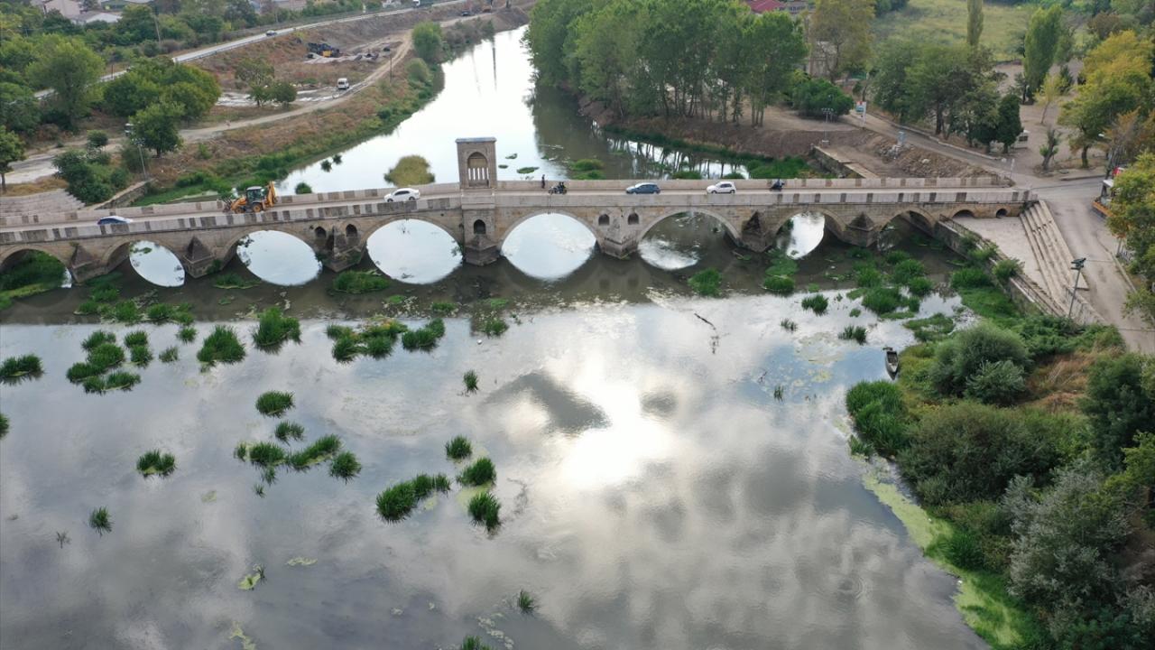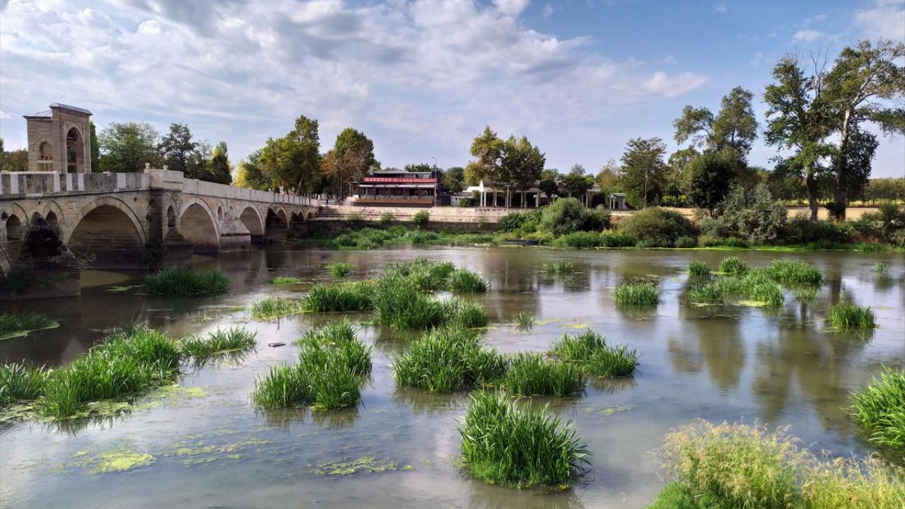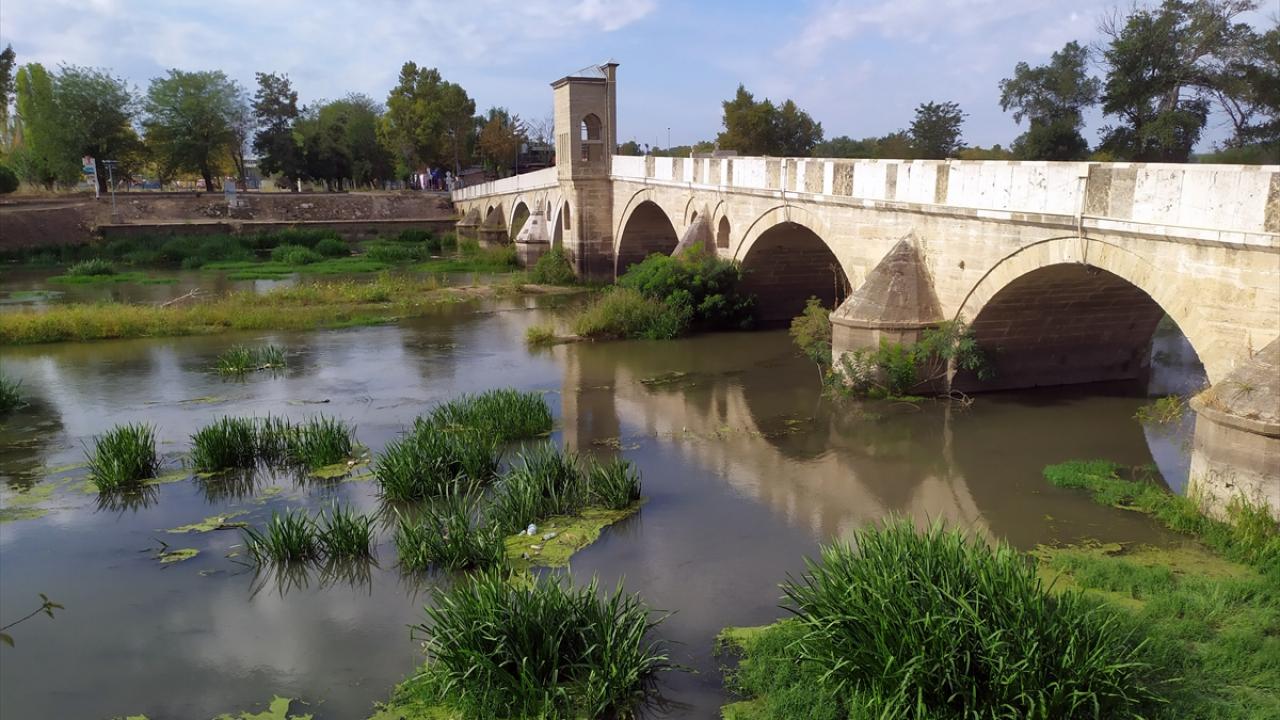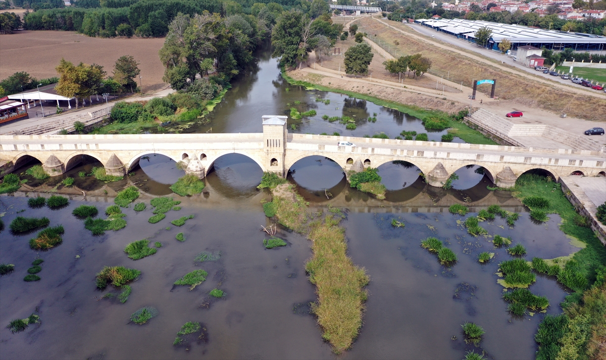 Nehirdeki kuraklığın en iyi görüldüğü Tunca Köprüsü civarında uzamış ot öbeklerinin yanı sıra kum adacıkları da gözleniyor.