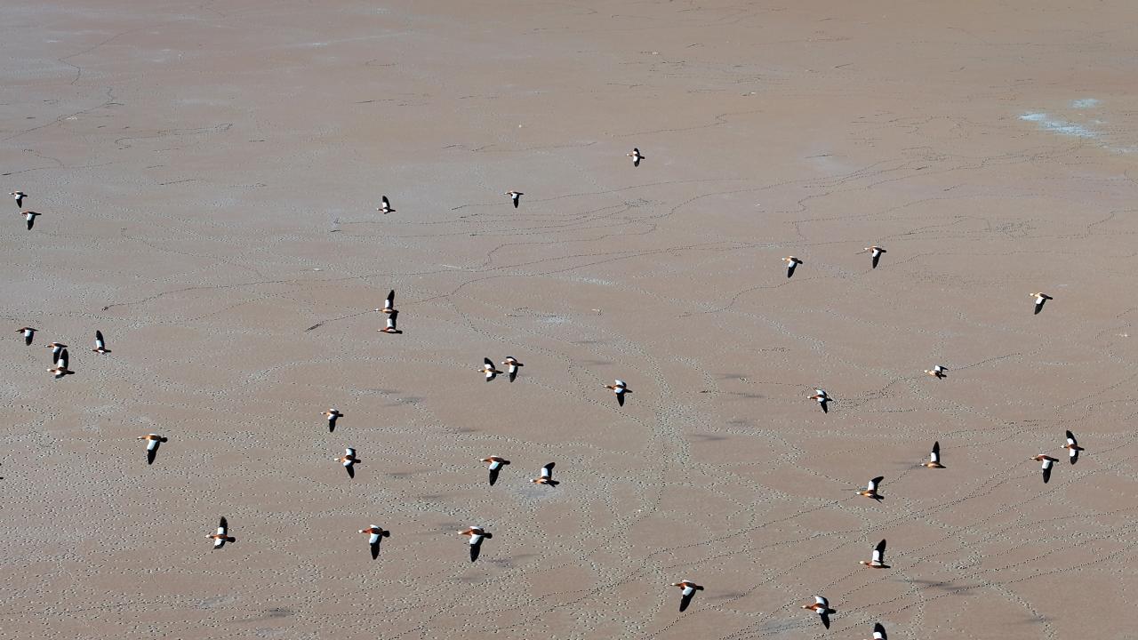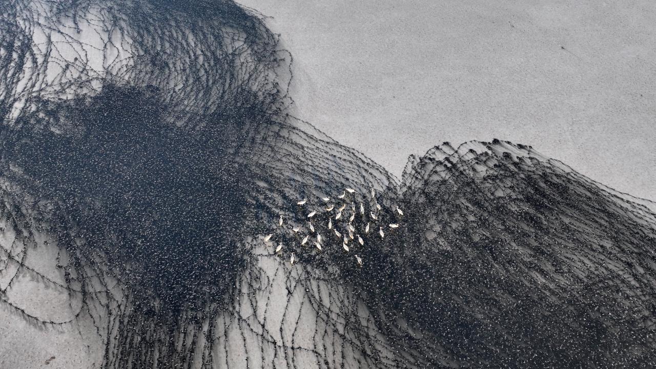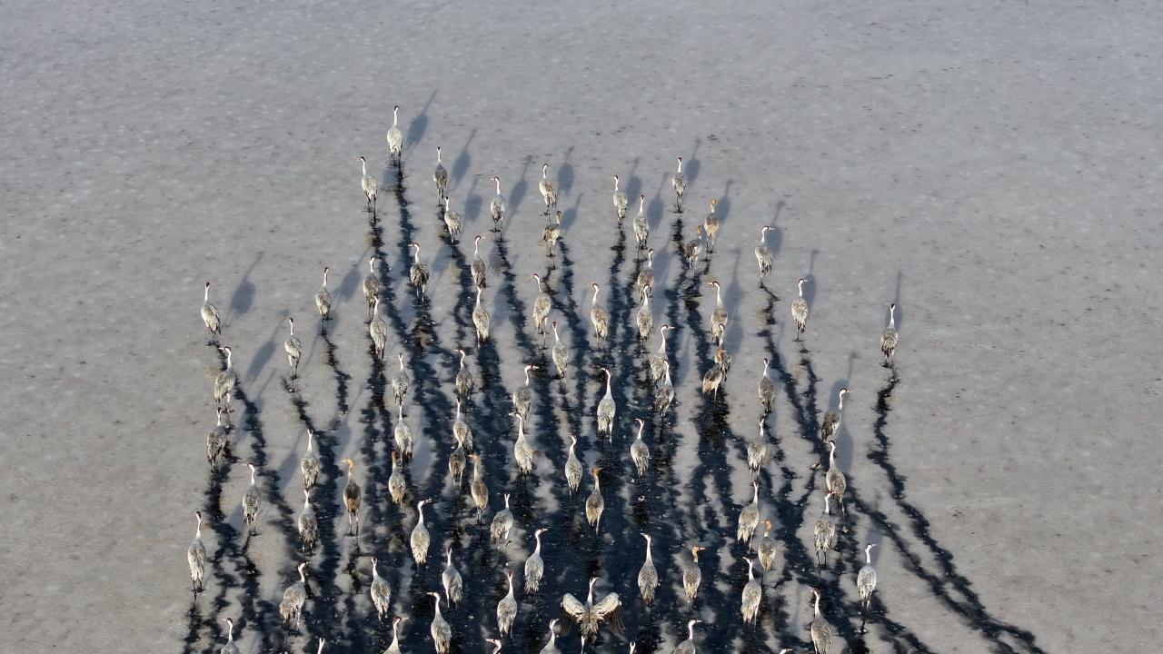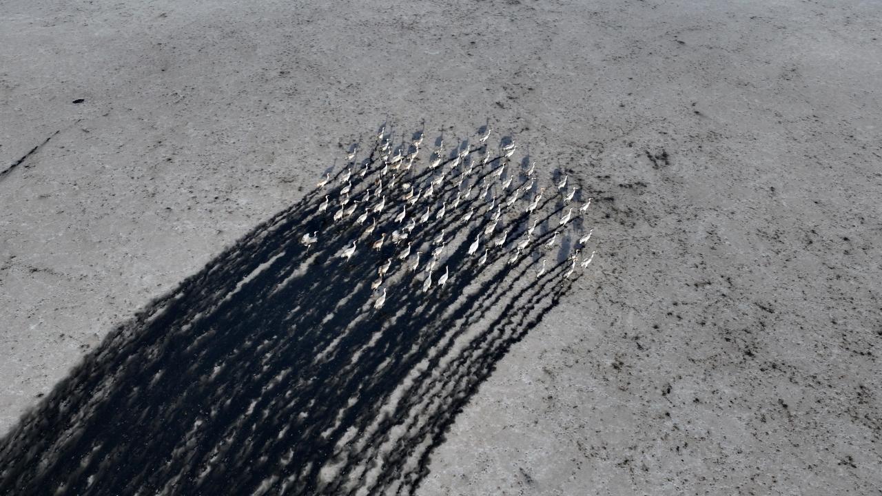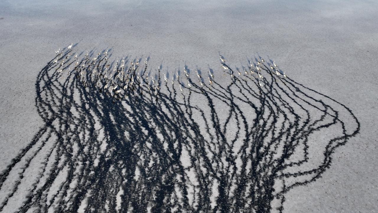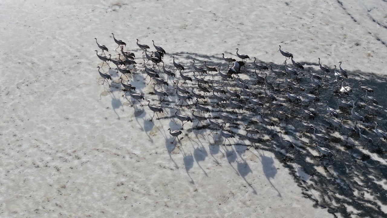 Öte yandan, kuşların gölün tuzla kaplı yüzeyindeki hareketlerinin ardından adeta karakalem tabloyu andıran görüntüler ortaya çıktı.
