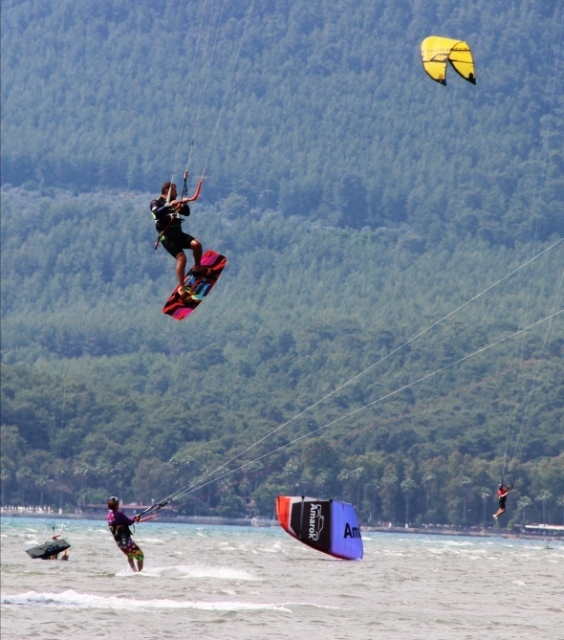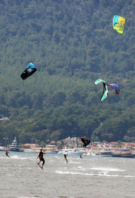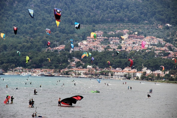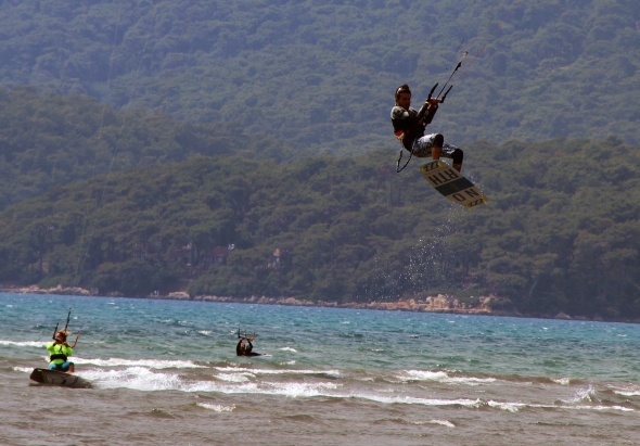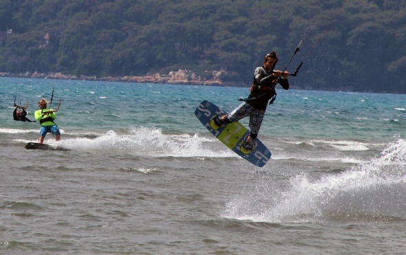 Türkiye’nin en önemli su sörfü alanına sahip Muğla’nın Ula ilçesine bağlı Gökova Körfezi içinde yer alan Akyaka sahilinde yüzlerce yerli ve yabancı turist su üstünde özgürlüğün tadını çıkarıyor.