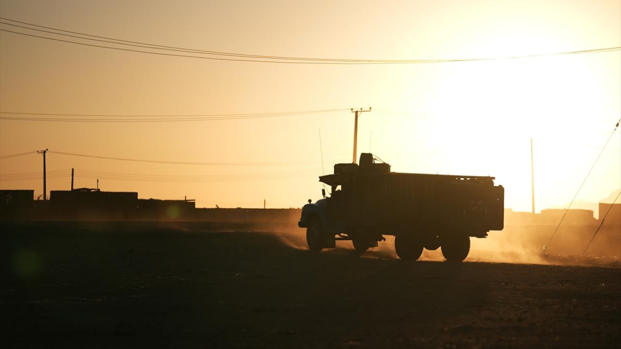 Bu yollar, yük taşıyan kamyonlar ve kasasında yolculuk eden insanlarla hareketli bir sahne sunuyor.