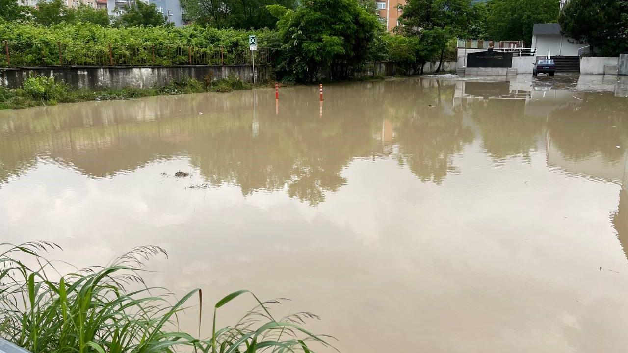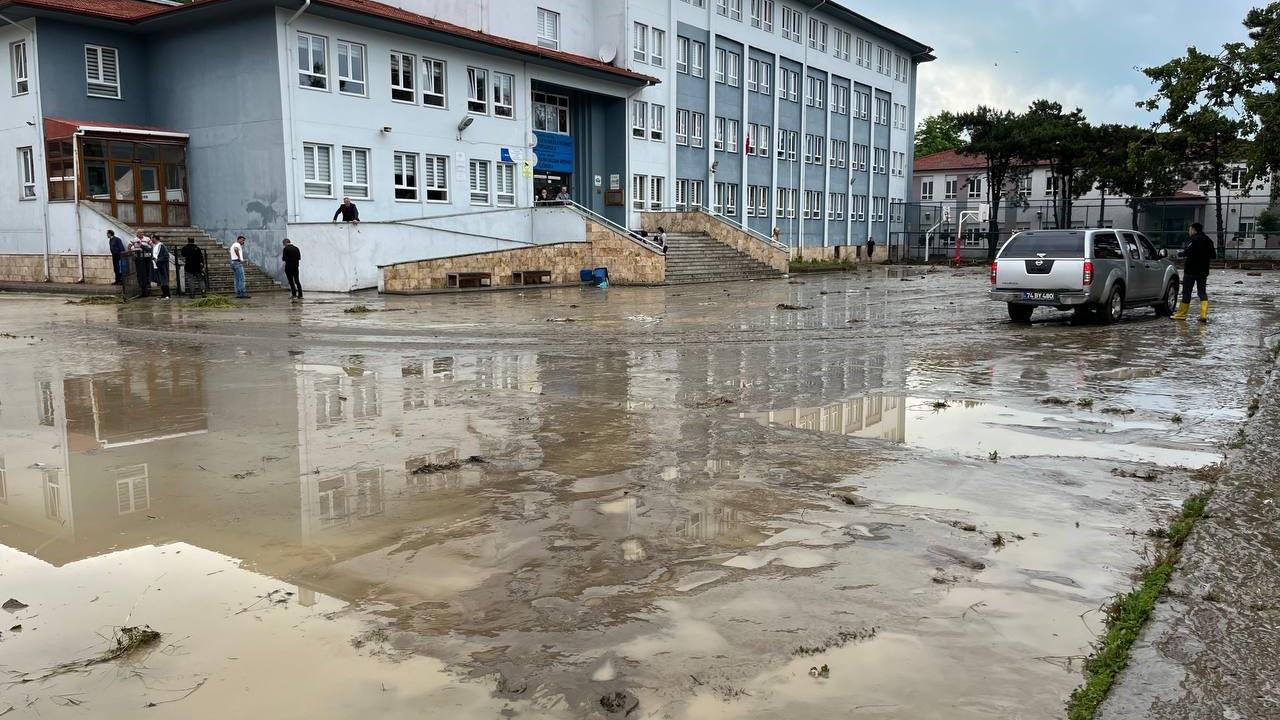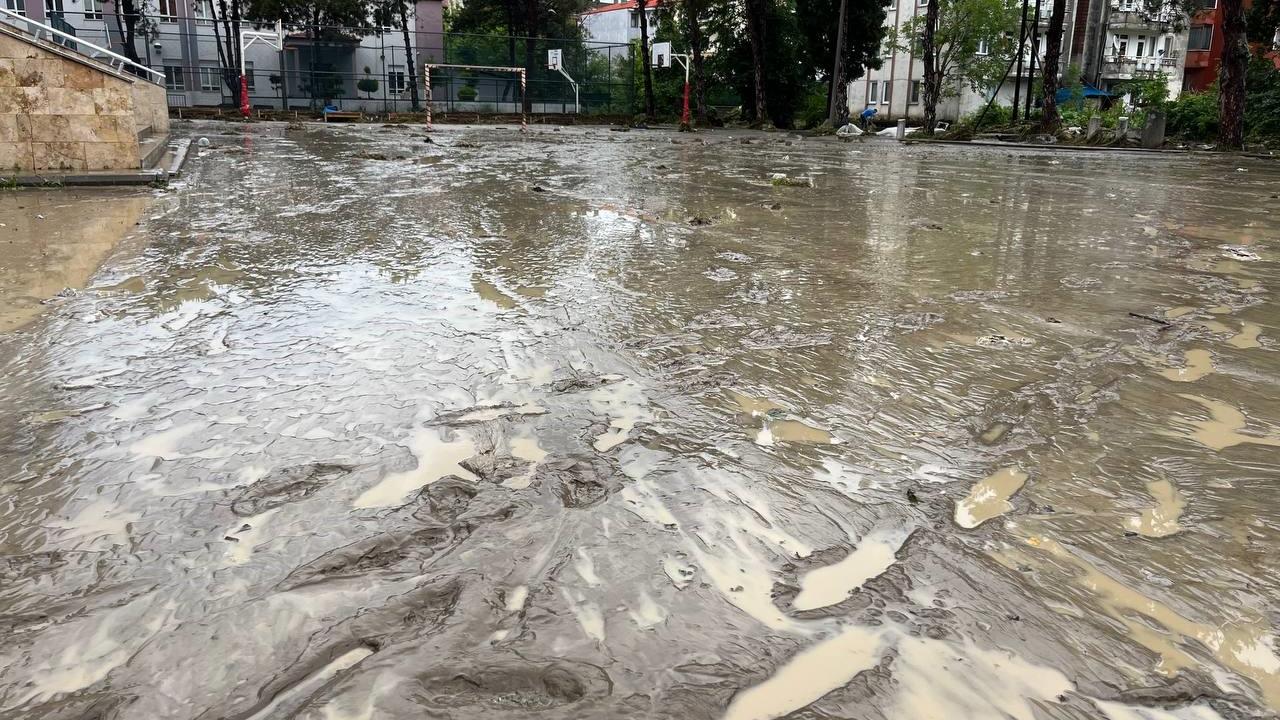 İlçe merkezindeki Fatih Sultan Mehmet İlk ve Ortaokulunun su basan bahçesi de balçıklarla kaplandı.