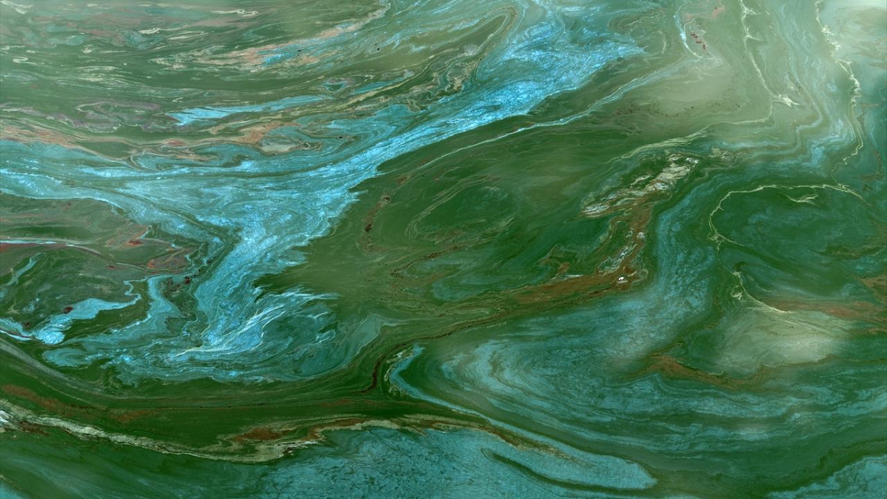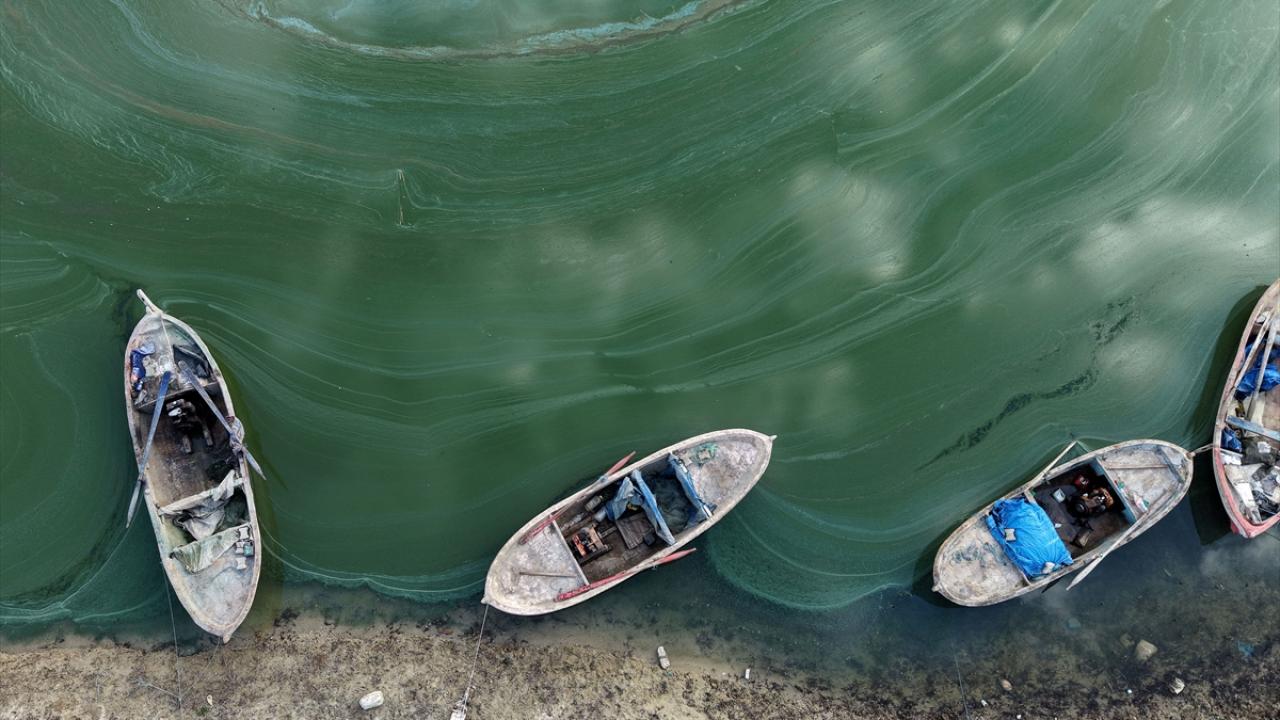 Manisa’nın Salihli ilçesindeki Demirköprü Barajı’nda su seviyesinin düşmesiyle birlikte yüzeyde oluşan yosun yayılımı genişledi.