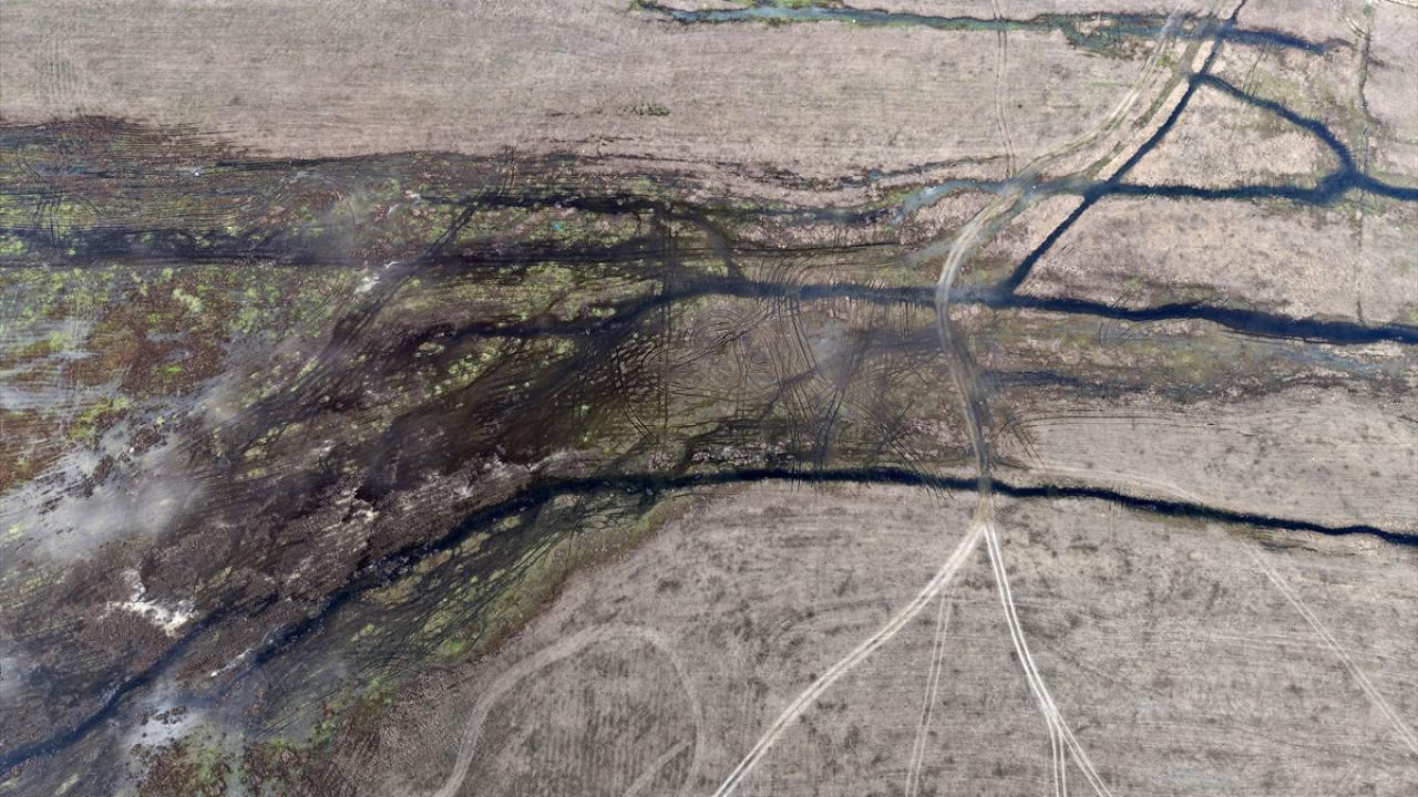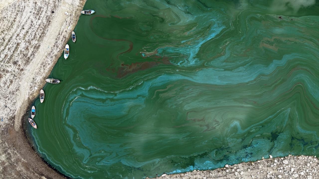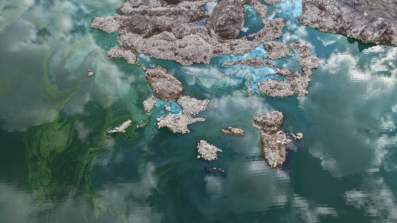 Barajda suların çekilmesiyle yosunla kaplanan alanlar dronla görüntülendi.