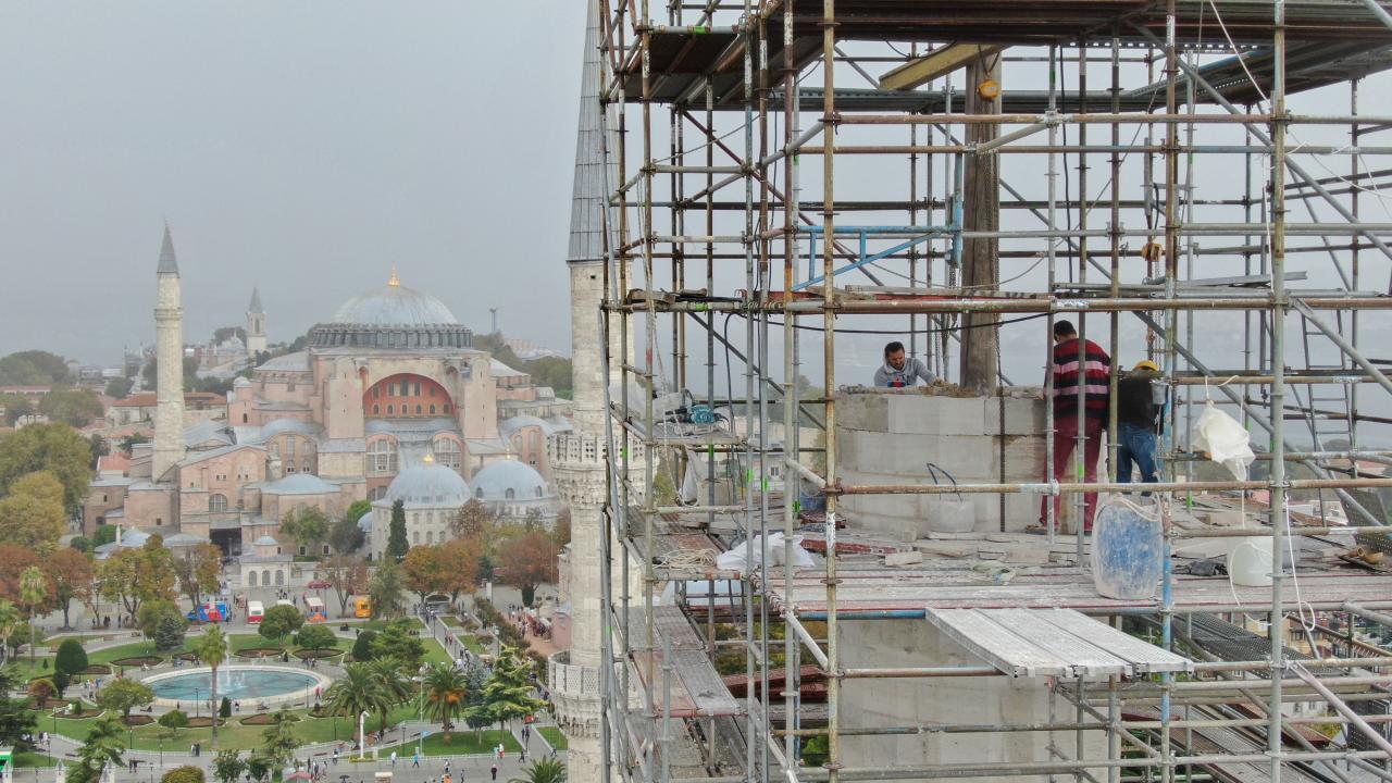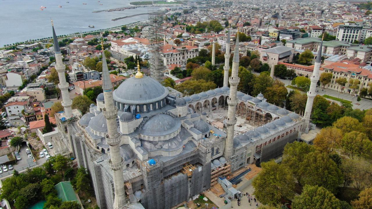 Osmanlı mimarisinin 6 minareli tek camisi olan Sultanahmet Camii’nin restorasyon çalışmalarında sona yaklaşıldı. Ana kubbesi tamamlanan caminin, dış cephesi ve avlusundaki devam eden çalışmalar ise dronla havadan görüntülendi.