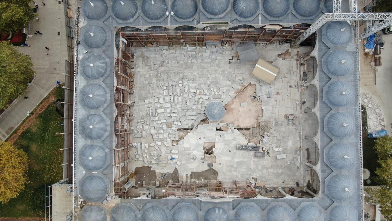 Öte yandan caminin dış cephesi ve avlusundaki işçilerin hummalı çalışması dronla havadan görüntülendi.