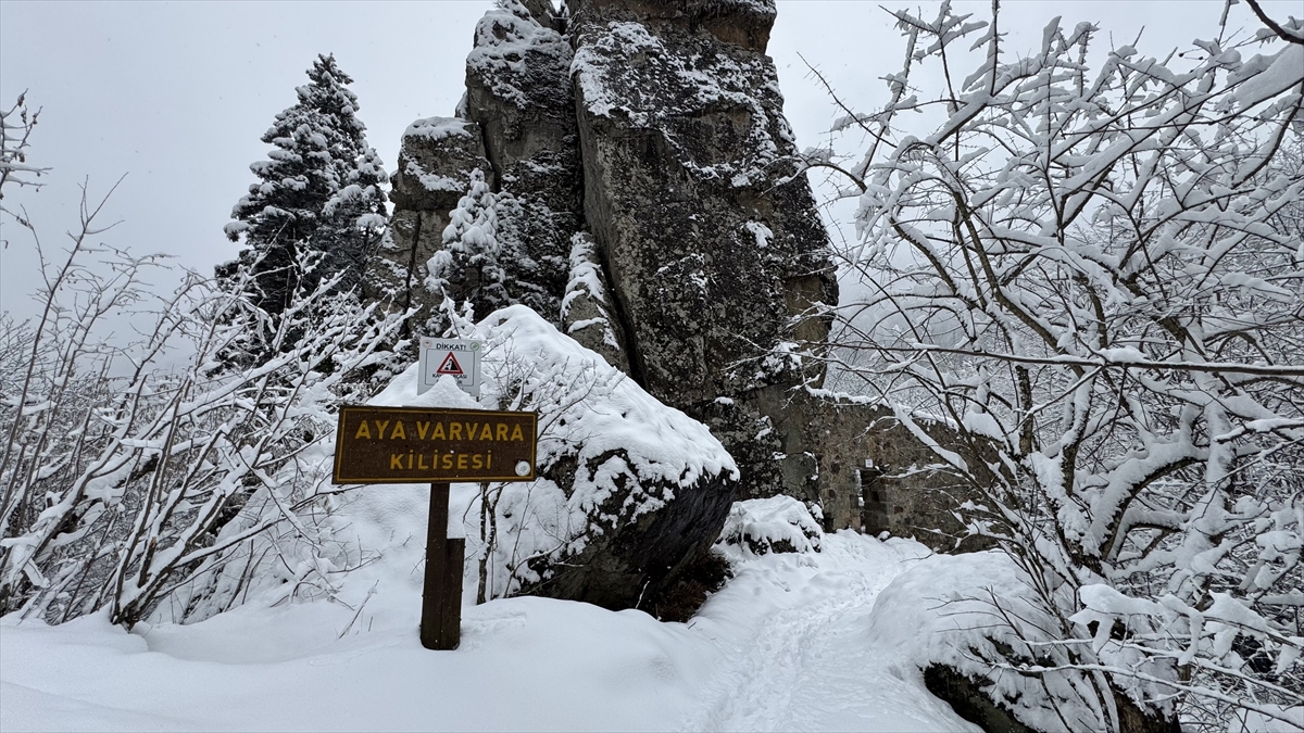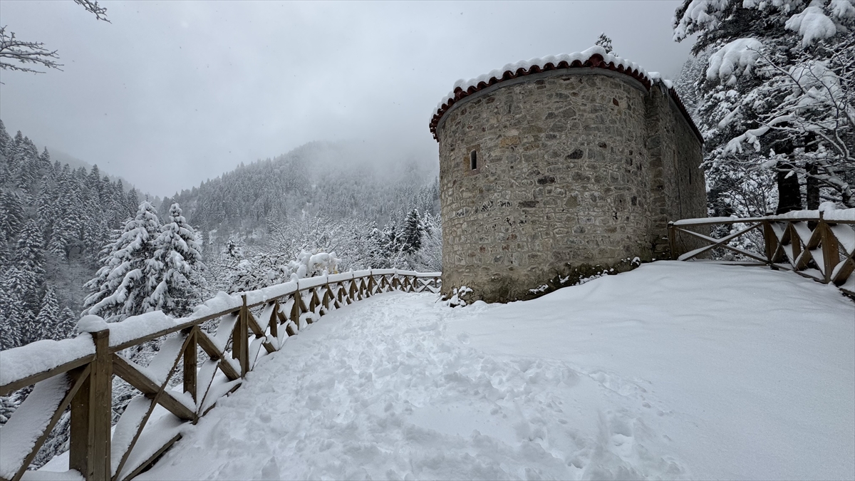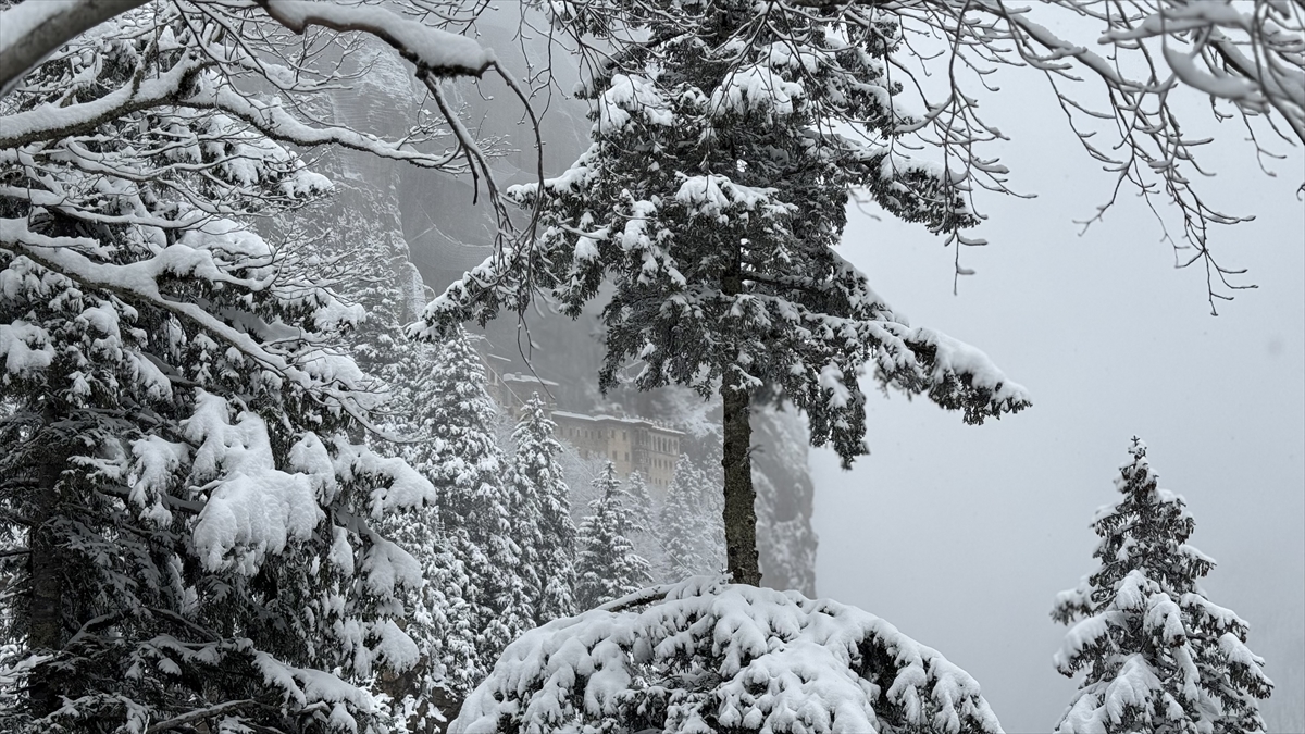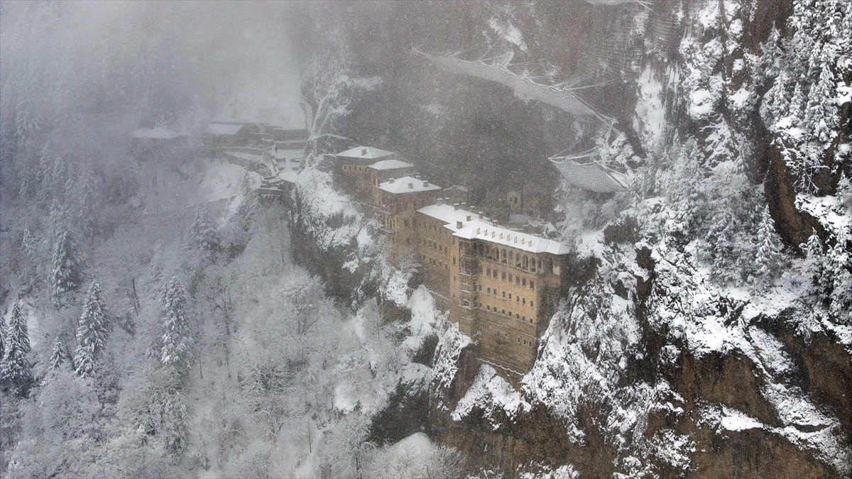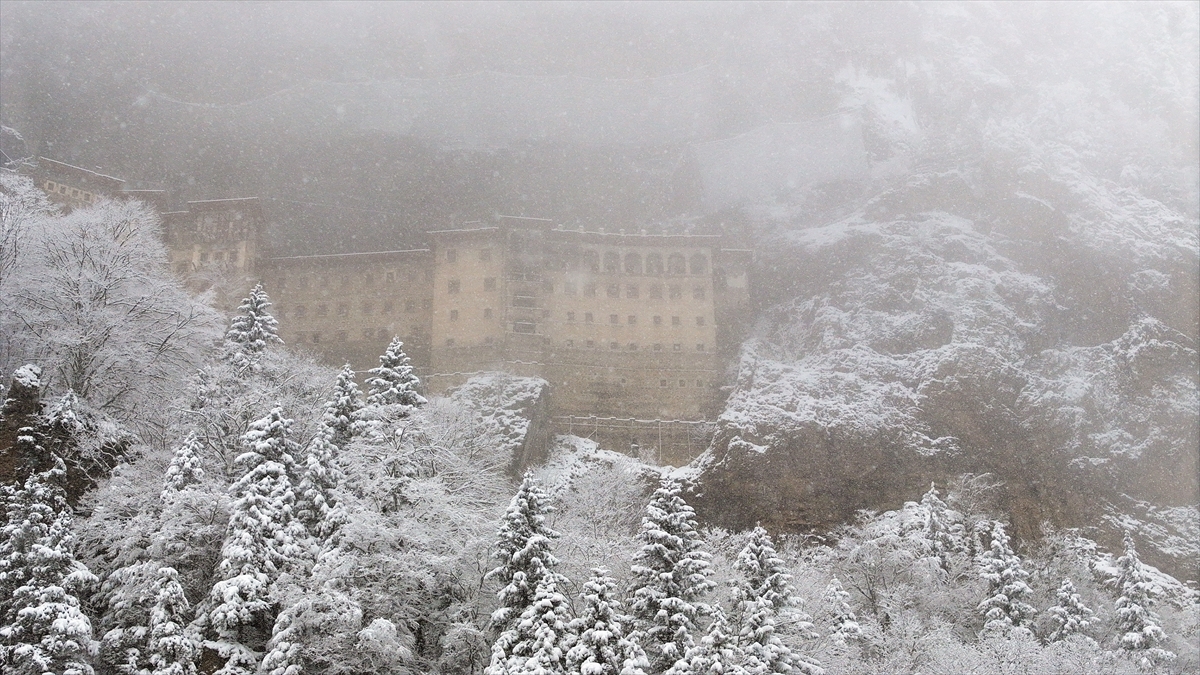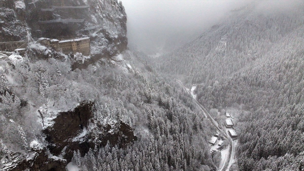 Karadağ`ın Altındere Vadisi`ne bakan eteğinde, vadiden yaklaşık 300 metre yükseklikteki ormanlık alanda kayalar oyularak yapılmış, halk arasında "Meryem Ana" adıyla bilinen Sümela Manastırı da etkili olan yağışın ardından beyaza büründü.