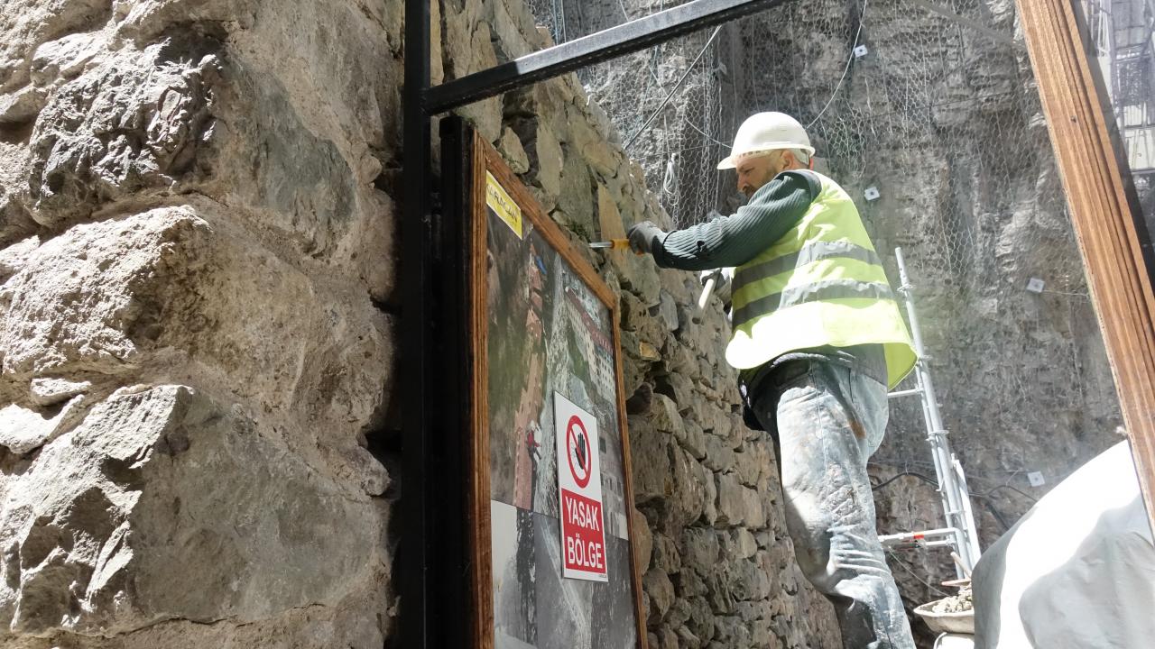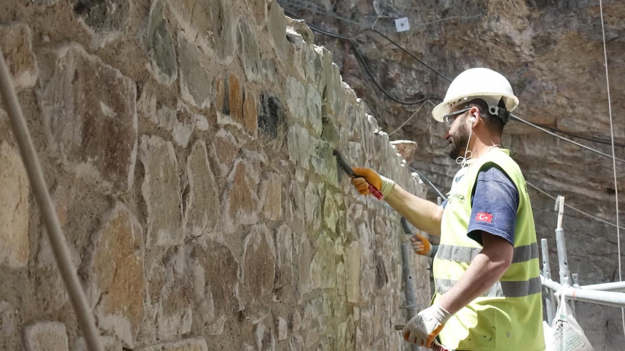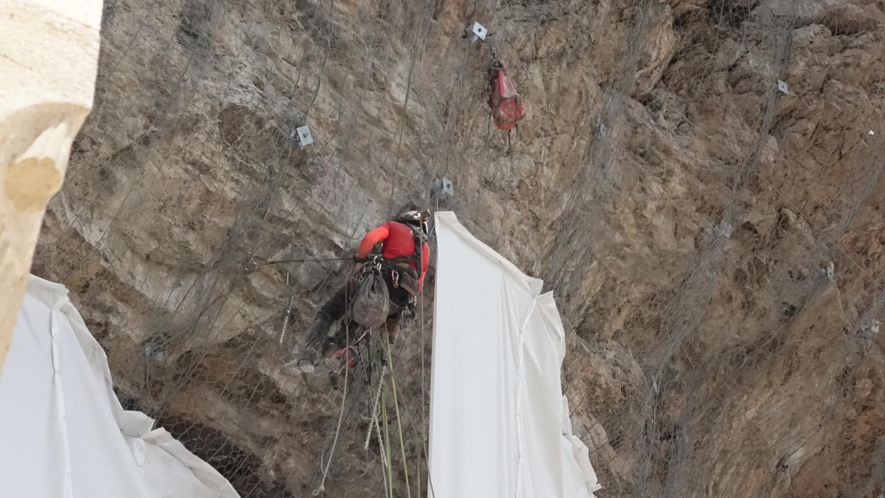 Kaya ıslahına yönelik çalışmalar kapsamında yamaçta toplam 11 bariyer planlandığını ve bunların her biri arasına 6-7 çelik kazık yerleştirildiğine işaret eden Asan, daha önce restorasyonun başında geçici olarak sabitleme yaptıkları kama blok kaya kütlesinde kalıcı olarak sabitleme çalışmalarının devam ettiğini, bu çalışmalarda da sona yaklaştıklarını anlattı.