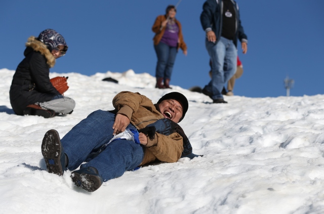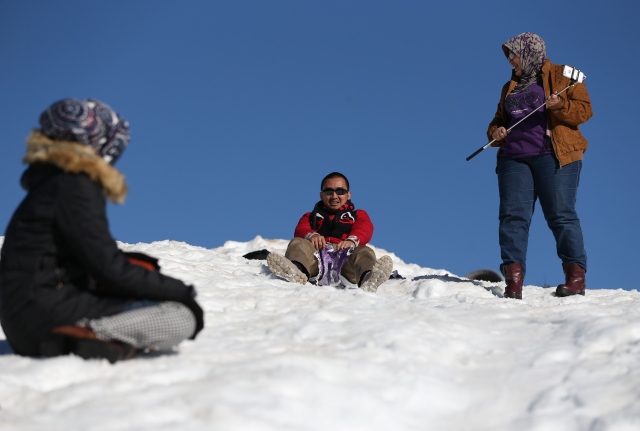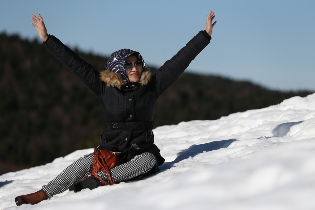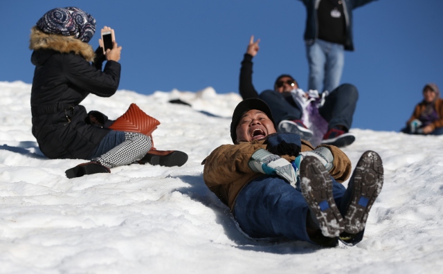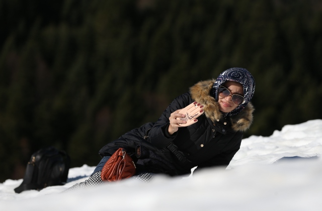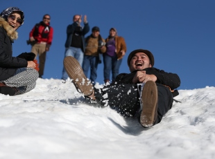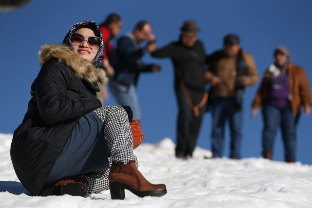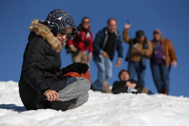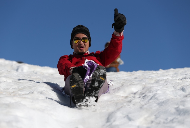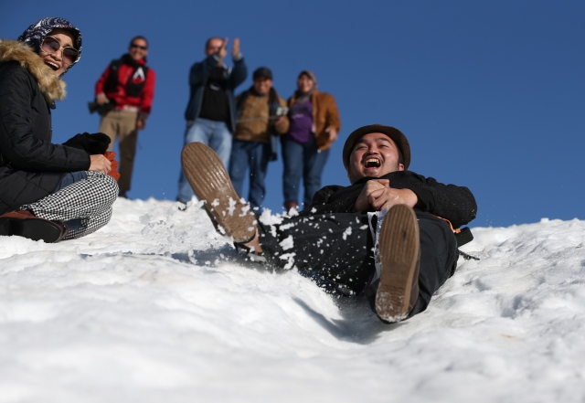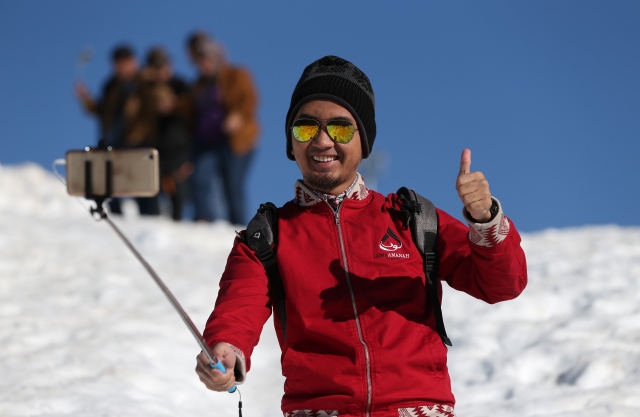 Türkiye'ye yaptıkları turistik gezide Uludağ'a da çıkan Endonezyalı grup, burada makineyle püskürtülen suni karda keyifli anlar geçirdi.