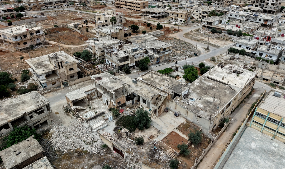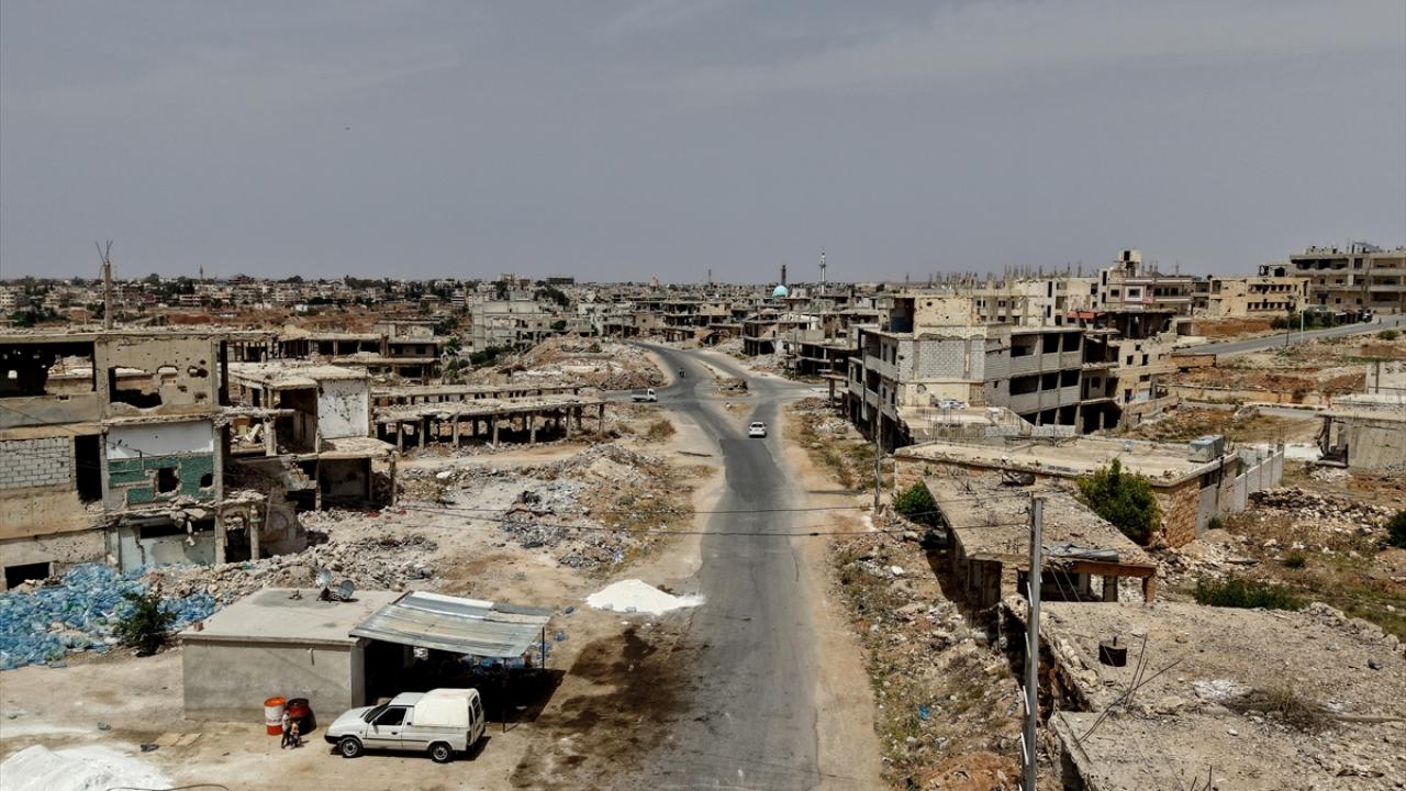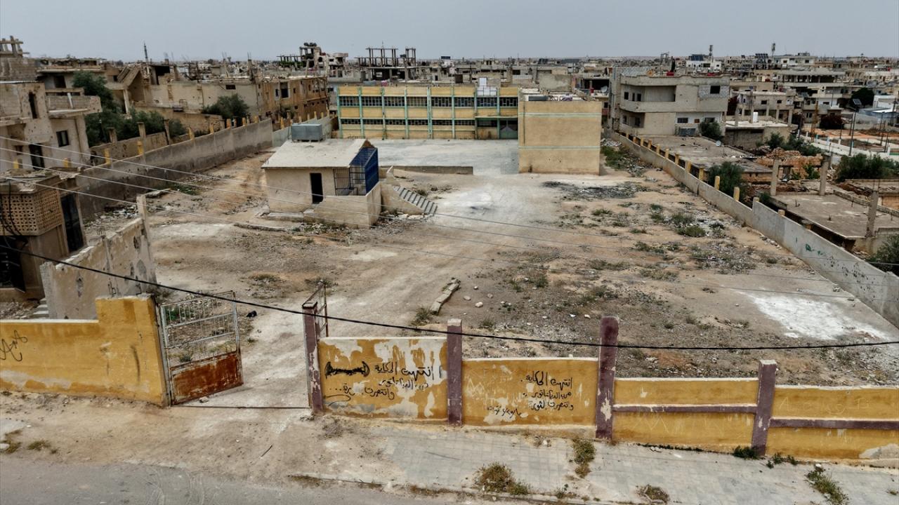 Kent merkezinde rejim saldırılarında büyük hasar alan okulların duvarında devrik Baas rejimini ve liderini hedef alan yazılar dikkat çekiyor.