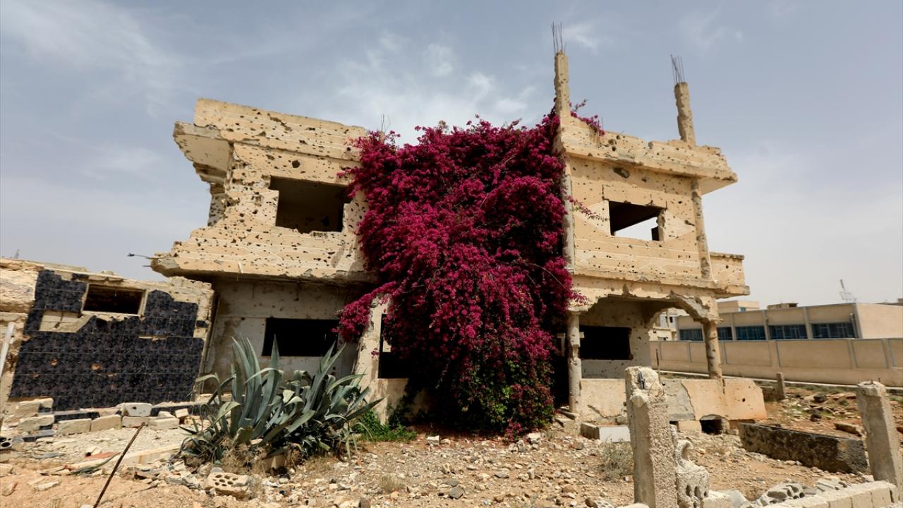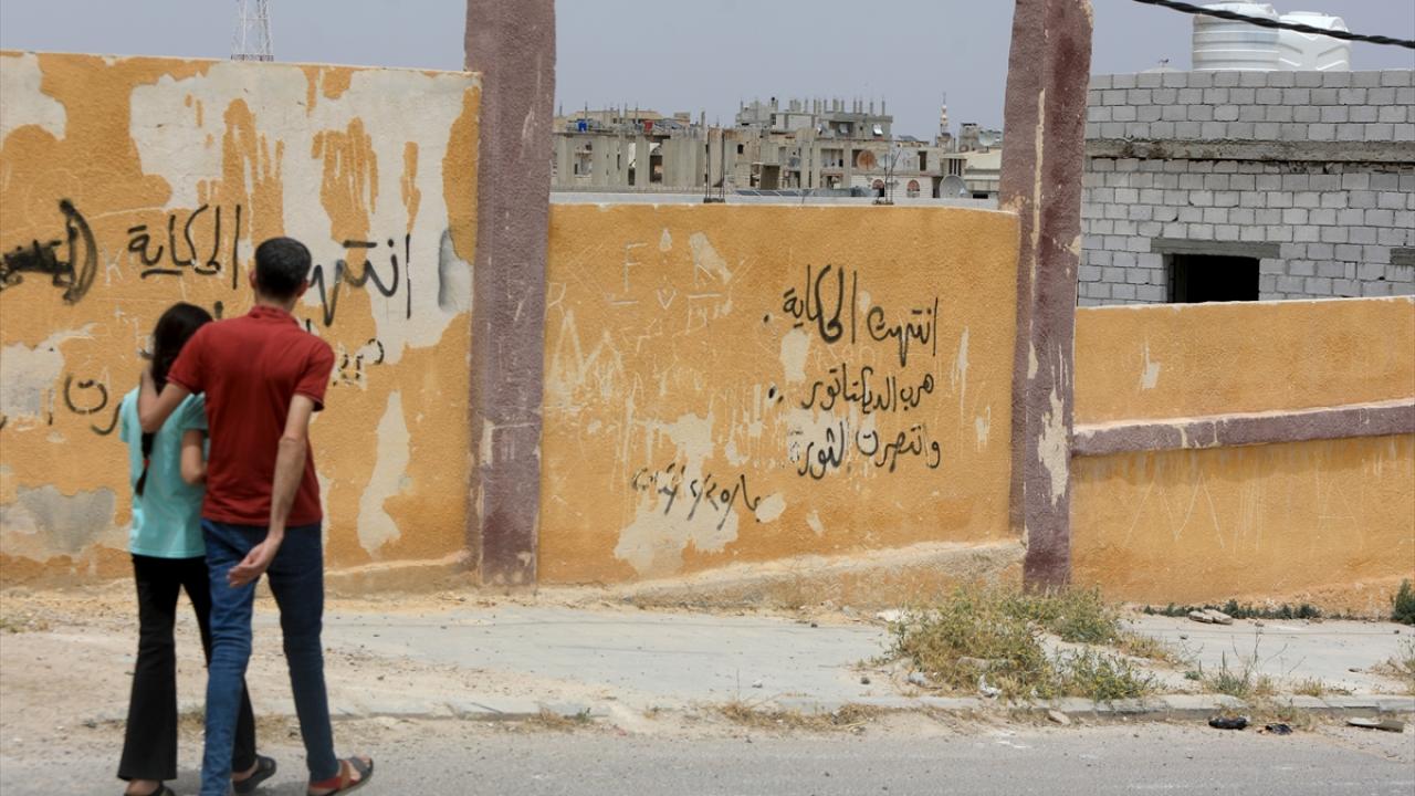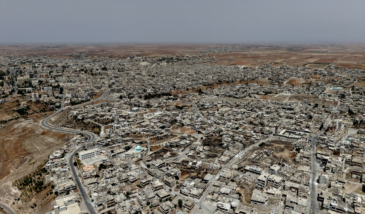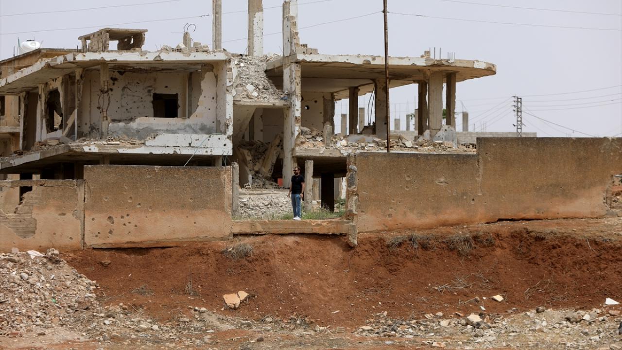 Kent merkezinde rejim saldırılarında büyük hasar alan okulların duvarında devrik Baas rejimini ve liderini hedef alan yazılar dikkat çekiyor.