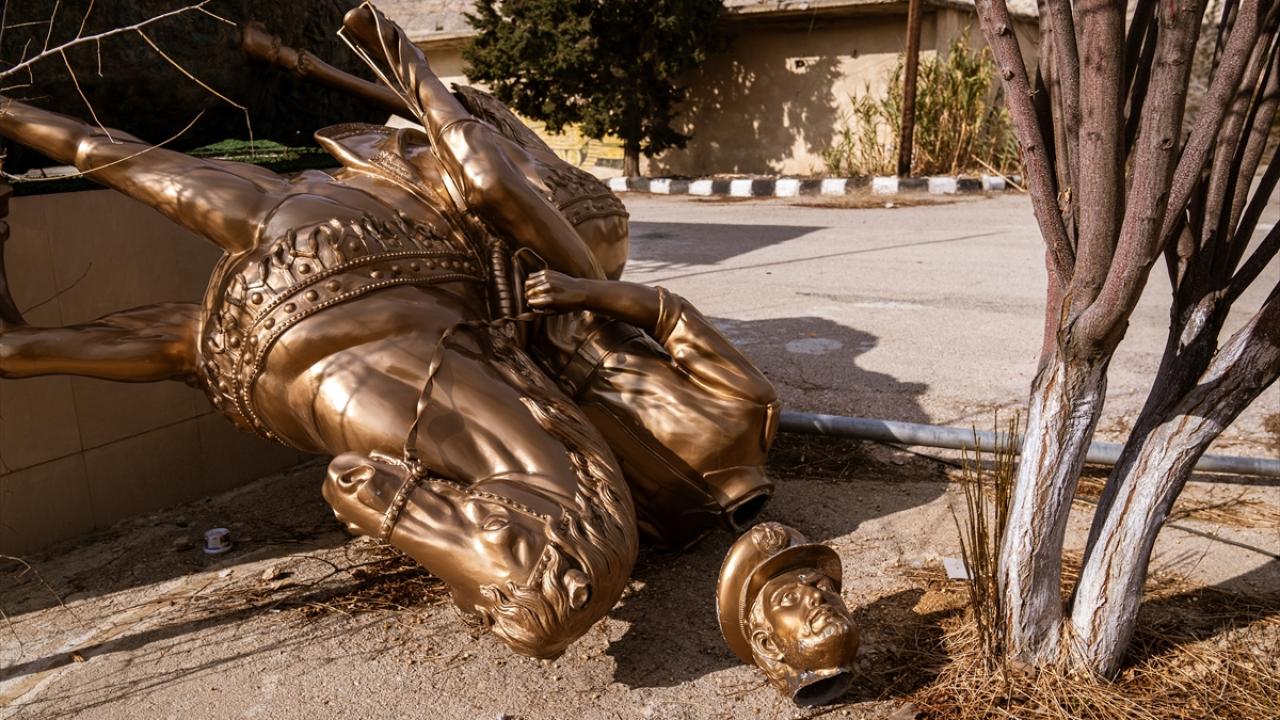 Kışlanın girişindeki duvarlarda baba Hafız Esed ile oğlu Beşşar Esed`in "alınlarından kurşunlandığı" fotoğraflar, Basil Esed`in "altın sarısı" yıkılmış heykeli göze çarpıyor.