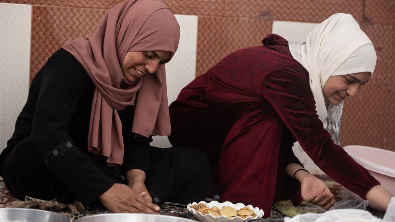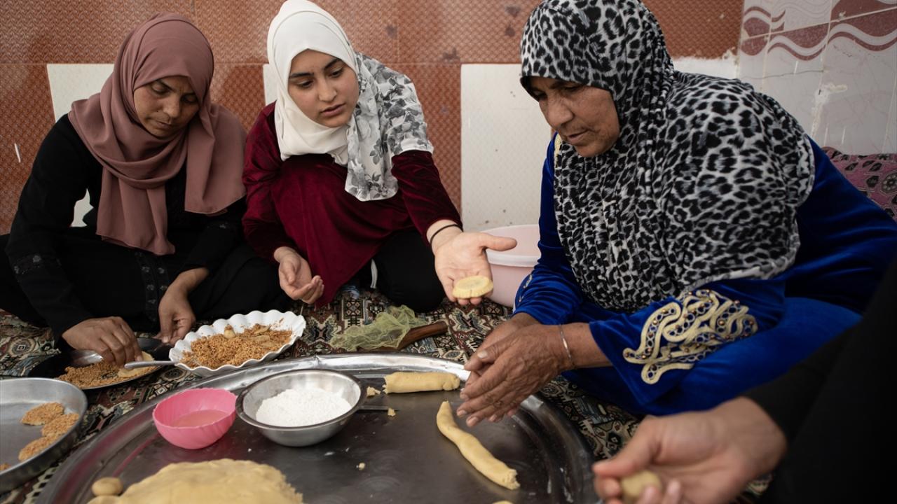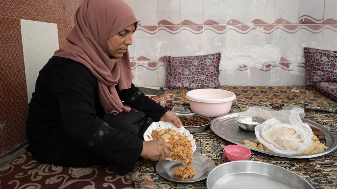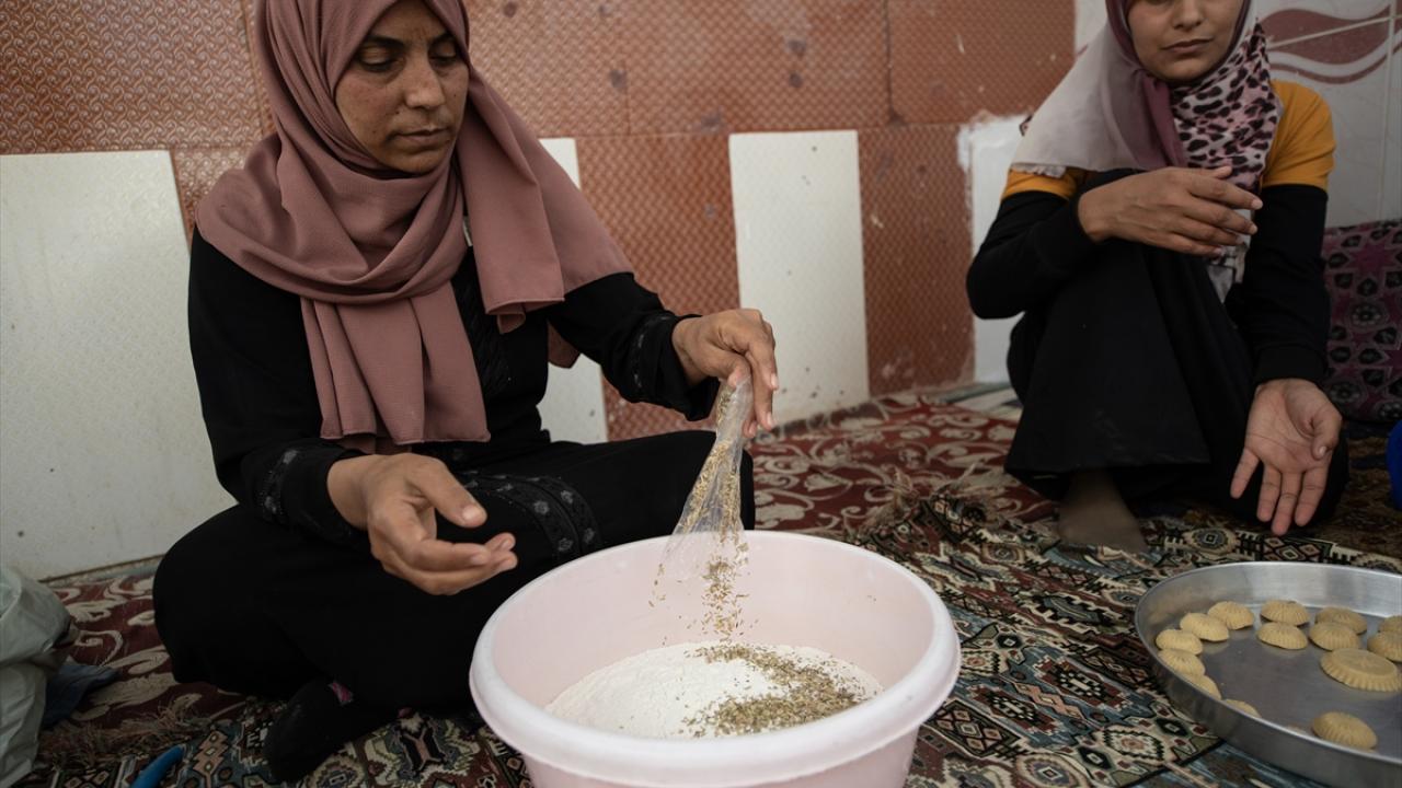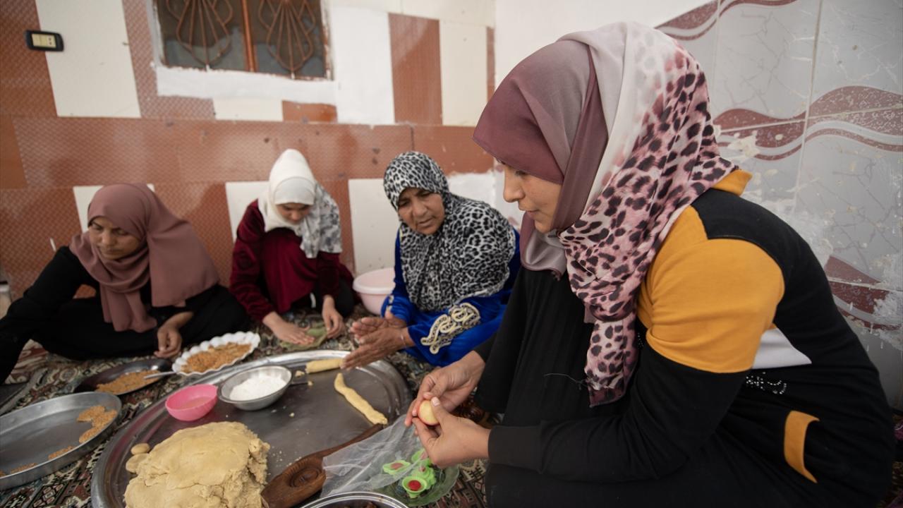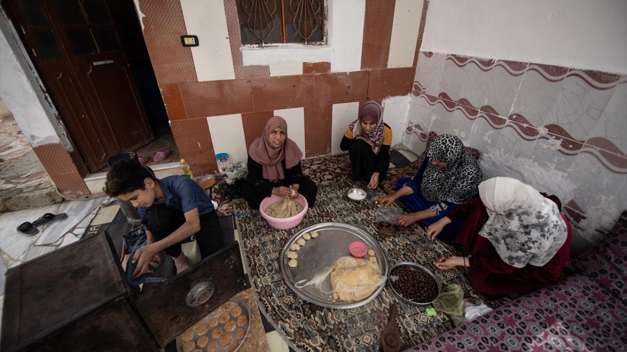 Suriye'nin Doğu Guta bölgesinde yaşayan Kuveyder ailesindeki kadınlar, ramazan bayramı hazırlıkları kapsamında geleneksel kurabiye ve tatlılar yapıyor.