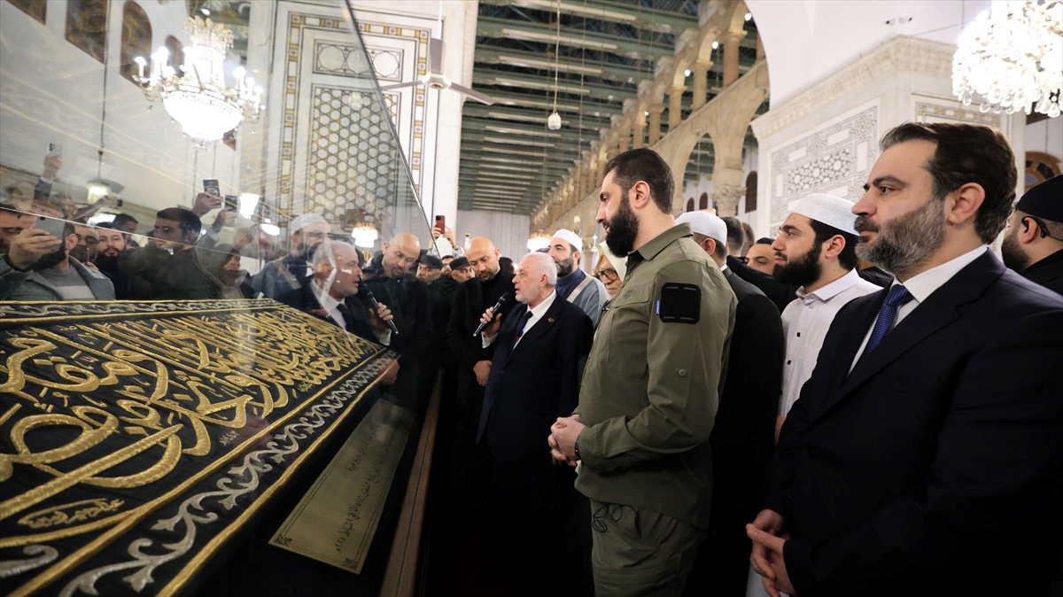 Suriye Cumhurbaşkanı Şara`ya, Dışişleri Esad Hasan Şeybani`nin de bulunduğu bazı bakanlar da eşlik etti. Şara, Suudi Arabistan`da devrik rejimin yıkılışının yıl dönümü münasebetiyle camiye takdim edilen Kabe örtüsünden alınan ve üzerine Kur’an-ı Kerim ayetleri işlenen hediyeyi açtı.