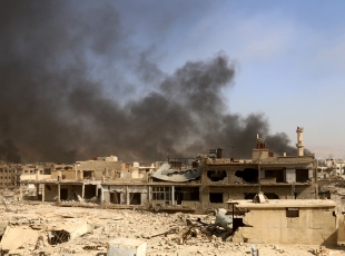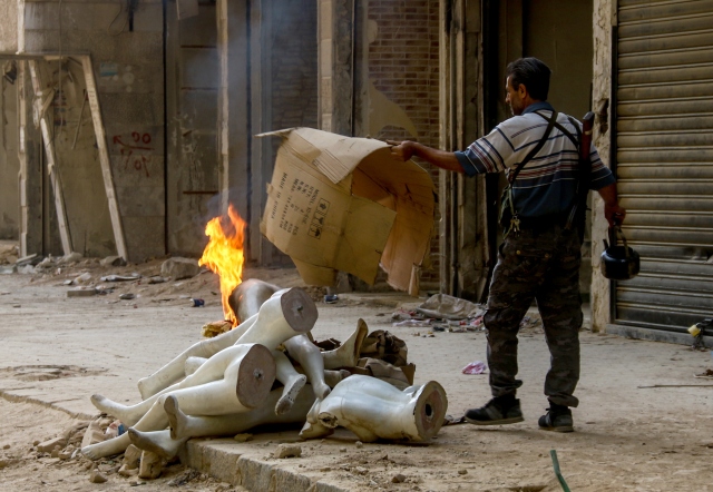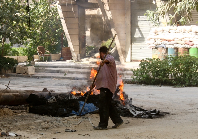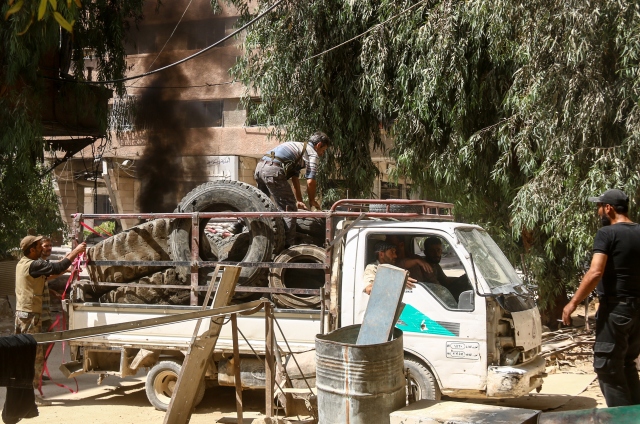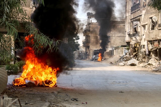 Suriyeli muhalifler, başkent Şam'ın Cobar bölgesinde Rus ve rejime ait savaş uçaklarının saldırılarından korunmak için araç lastikleri yakarak uçakların görüş mesafesini engellemeye çalıştı. Muhalifler, iş makinalarına ait lastikleri yakacakları yere taşıdı.