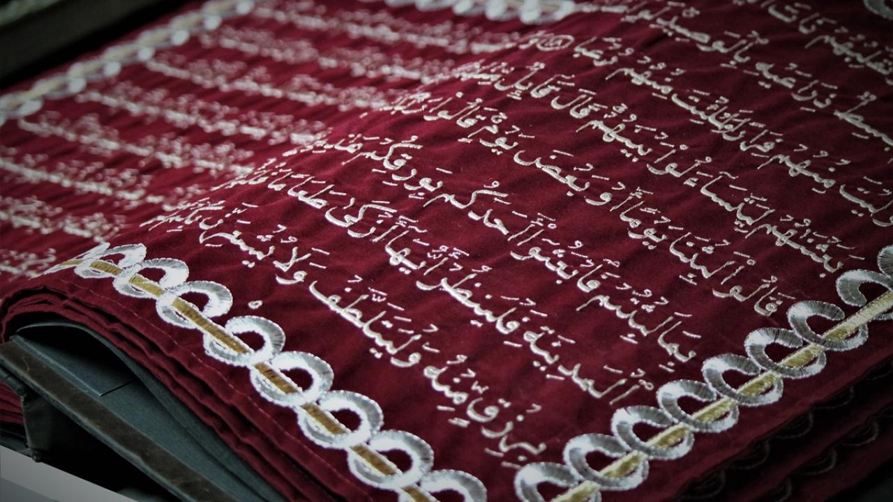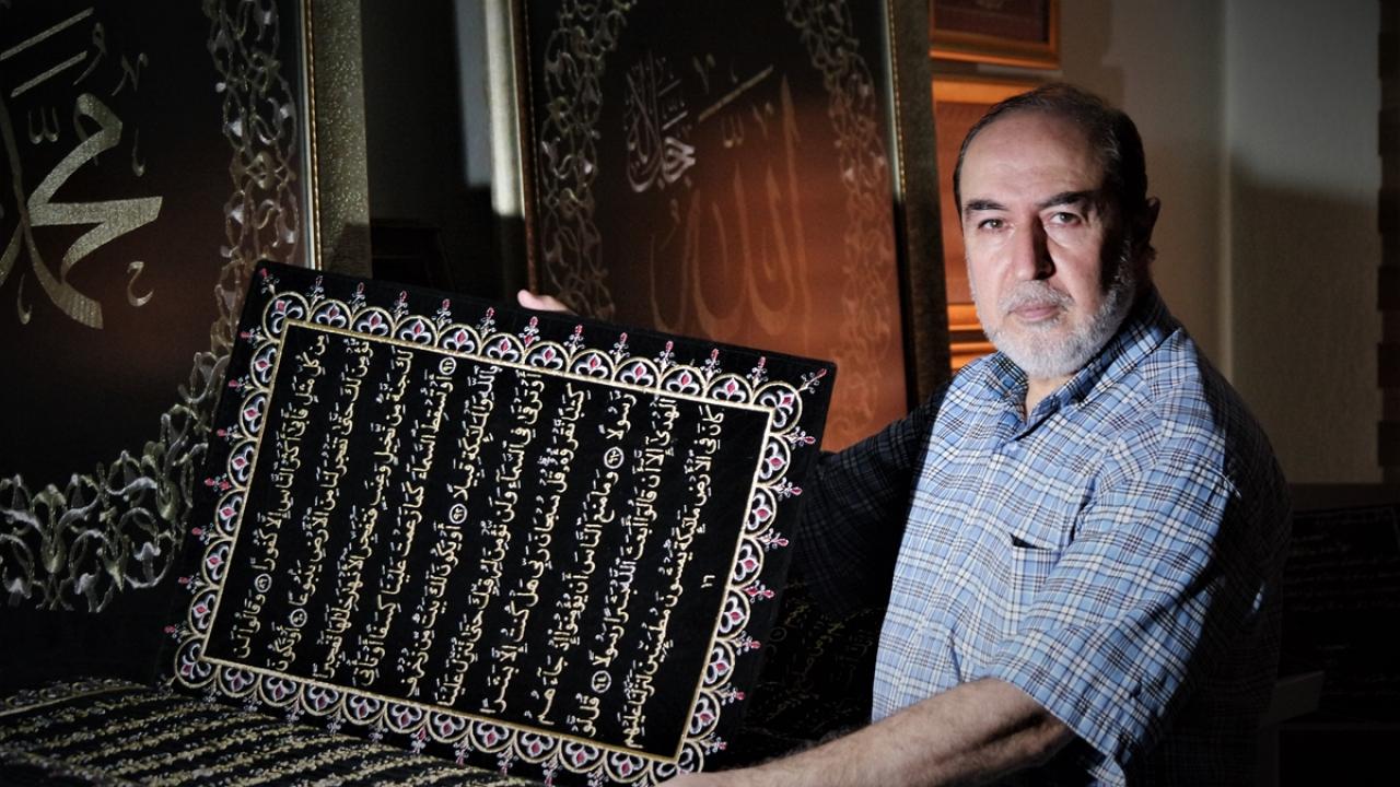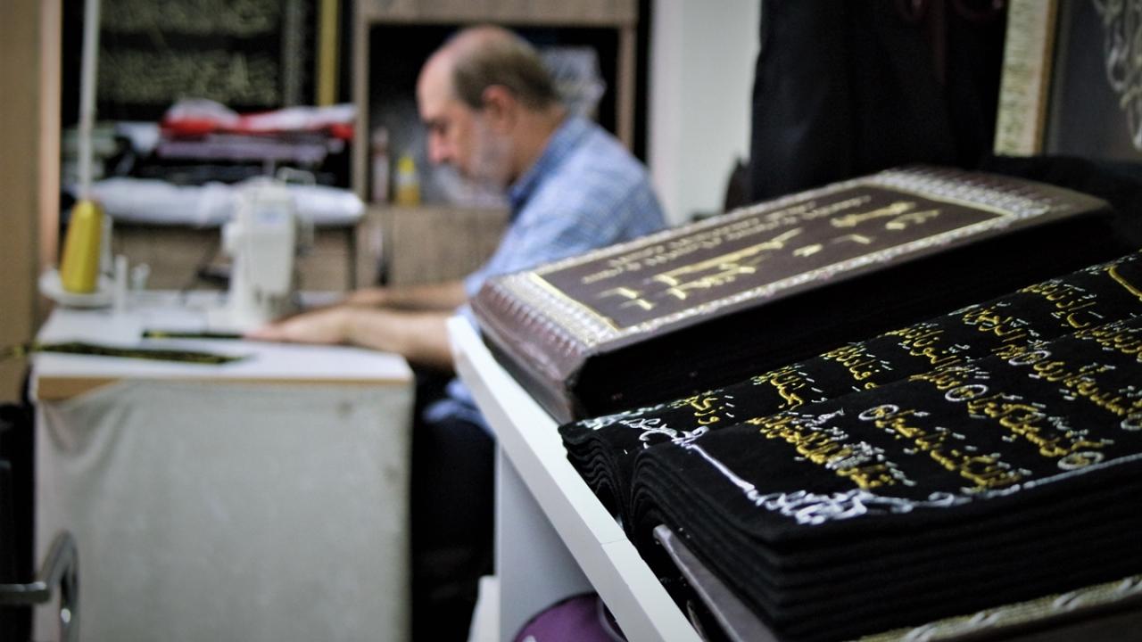 Suriyeli hattat, dua ayeti ve hadisleri kumaşa nakşediyor