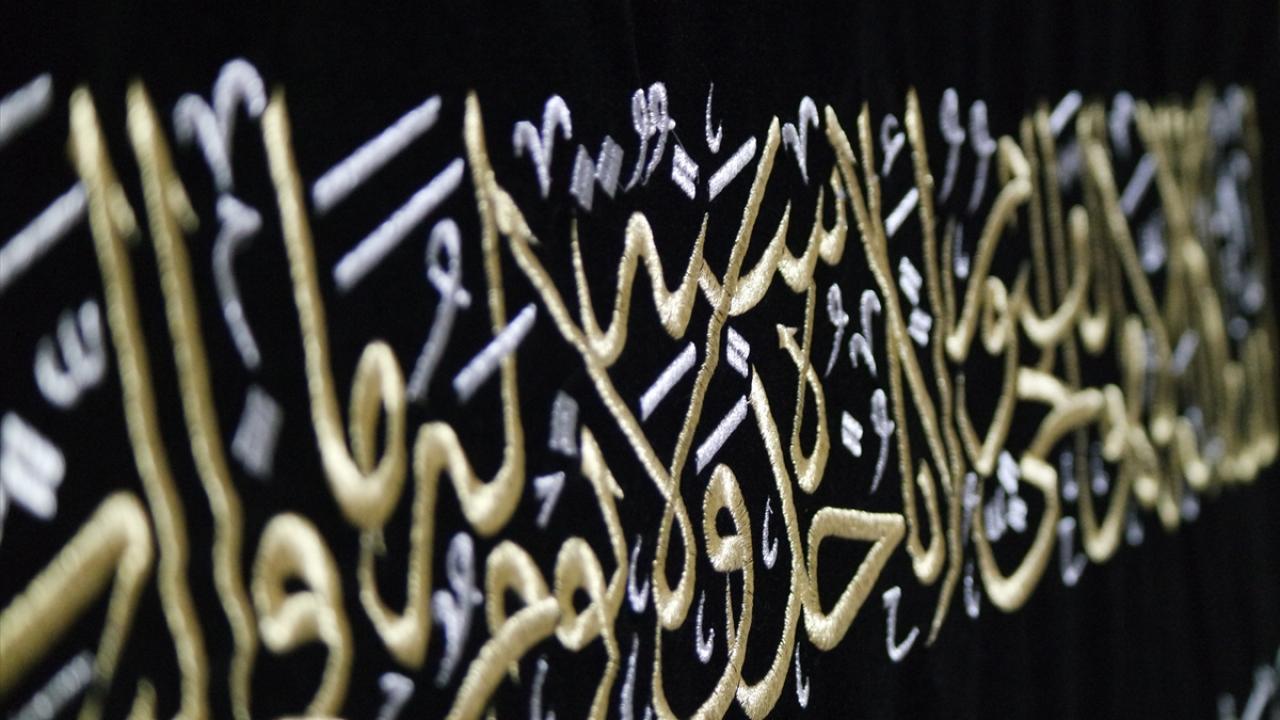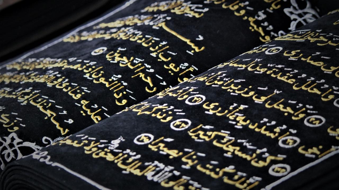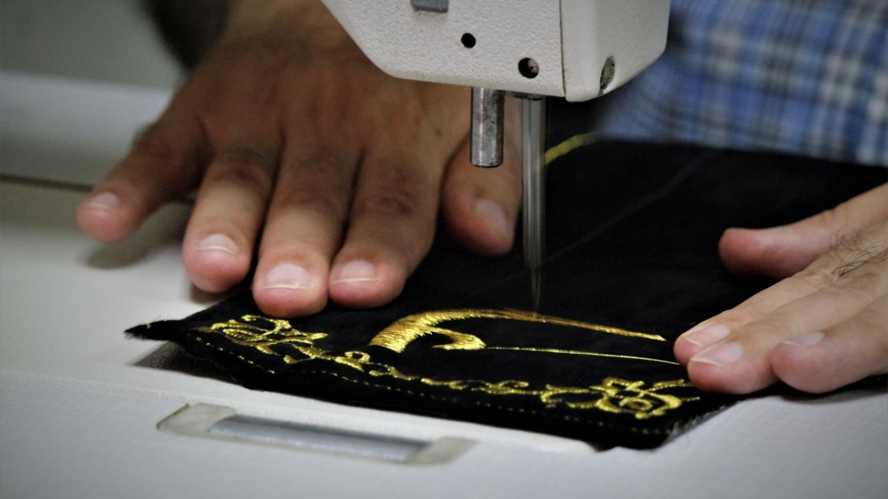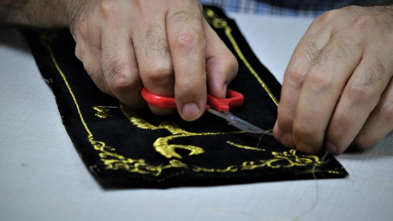 Kur'an-ı Kerim'i kumaş üzerine yazmaya niyet edip "Ve ma tevfiki illa billah" (Başarı ancak Allah'tandır) yazısıyla çalışmalarına başlayan hattat Muhammed Mahir Hadri, Bursa'daki atölyesinde dua ayeti ve hadisleri kumaşa nakşediyor.