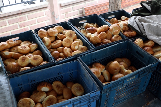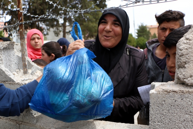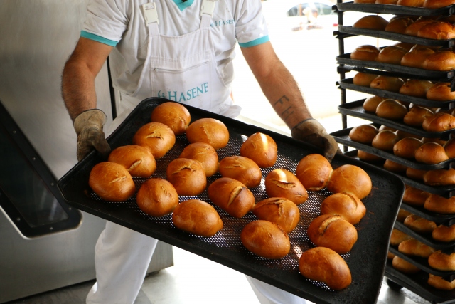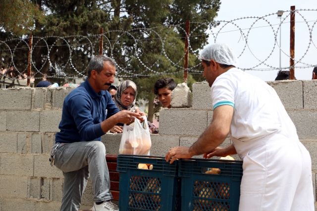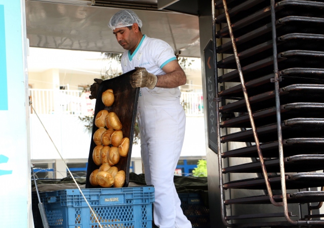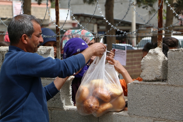 Şanlıurfa'nın Akçakale ilçesinde Hasene Yardım Derneği tarafından mobil fırında günlük üretilen 6 bin ekmek, ihtiyaç sahibi Suriyeli ve Türk vatandaşlara dağıtılıyor.