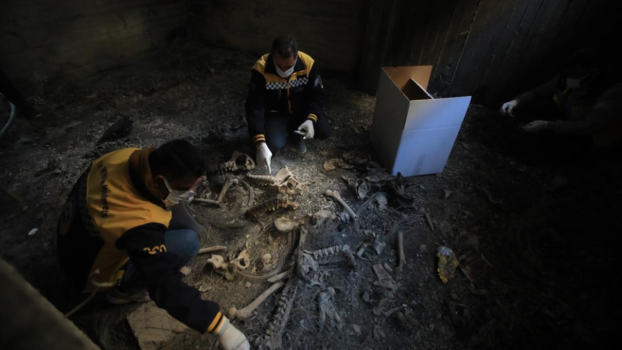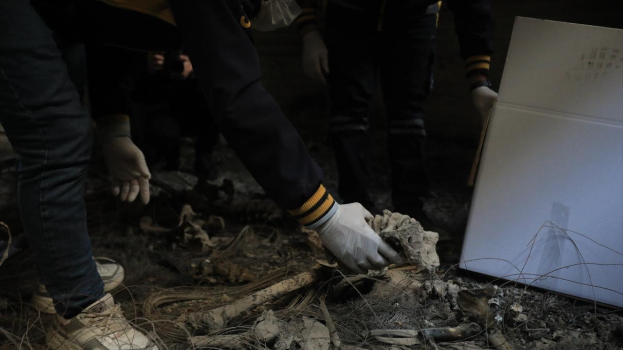 Suriye Sivil Savunma ekipleri, Şam`ın Sibeyne bölgesinde devrik Baas rejiminin sivilleri alıkoymak için kullandığı binanın bodrum katında toplu mezar buldu.