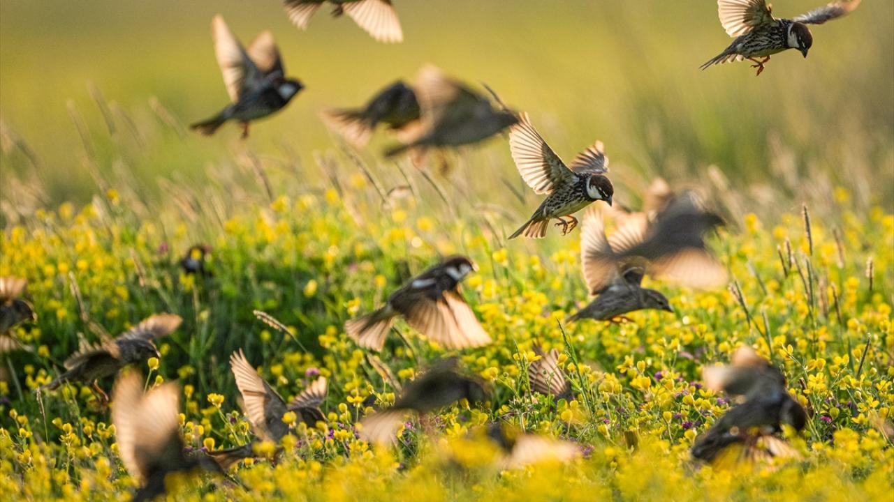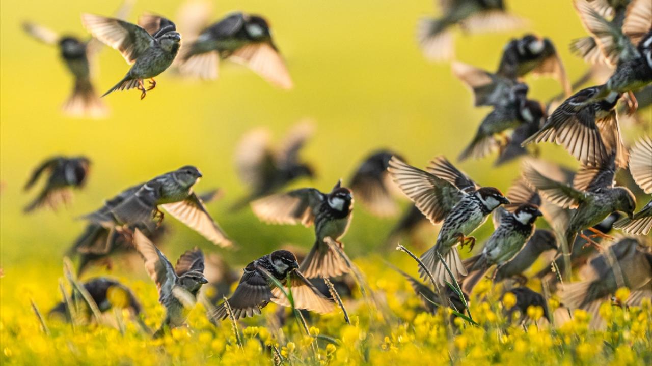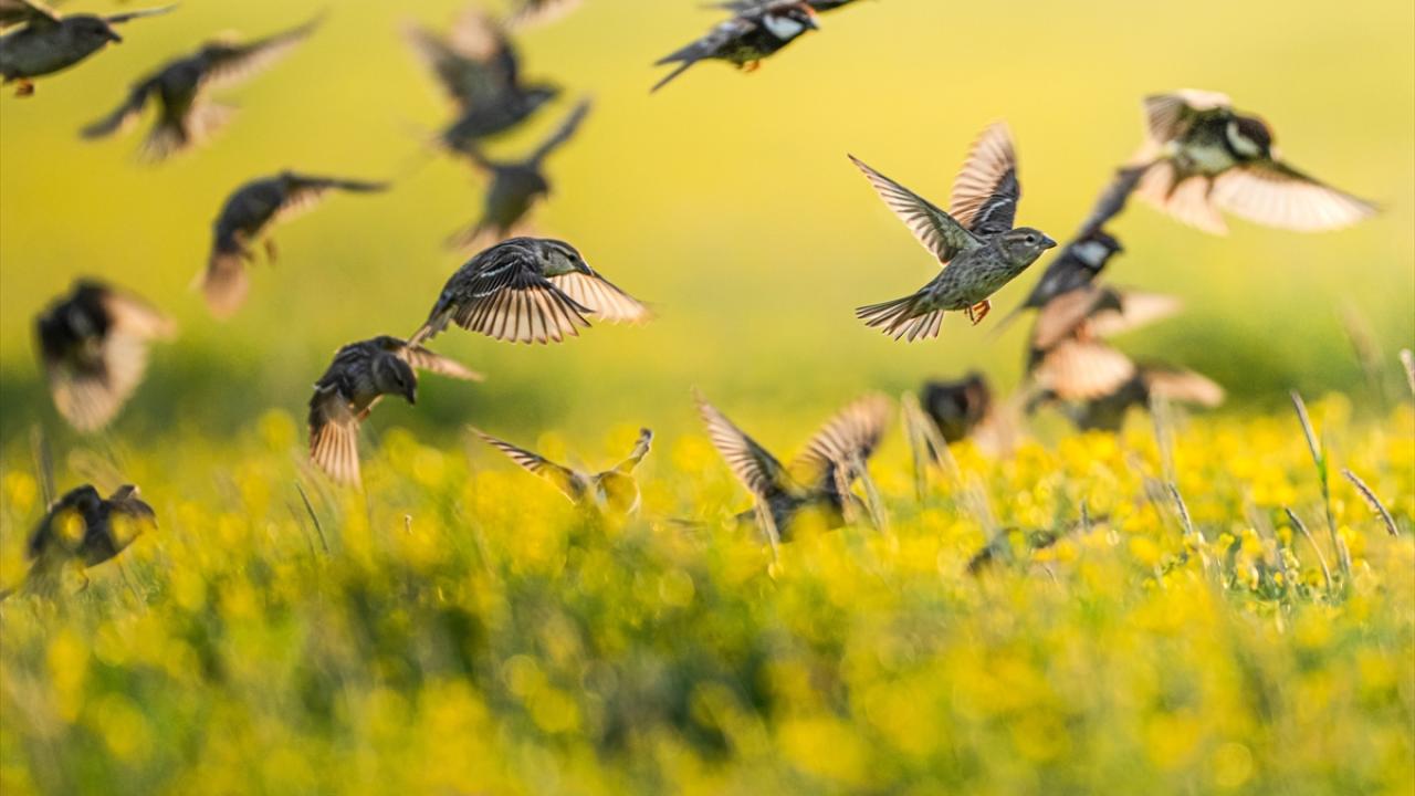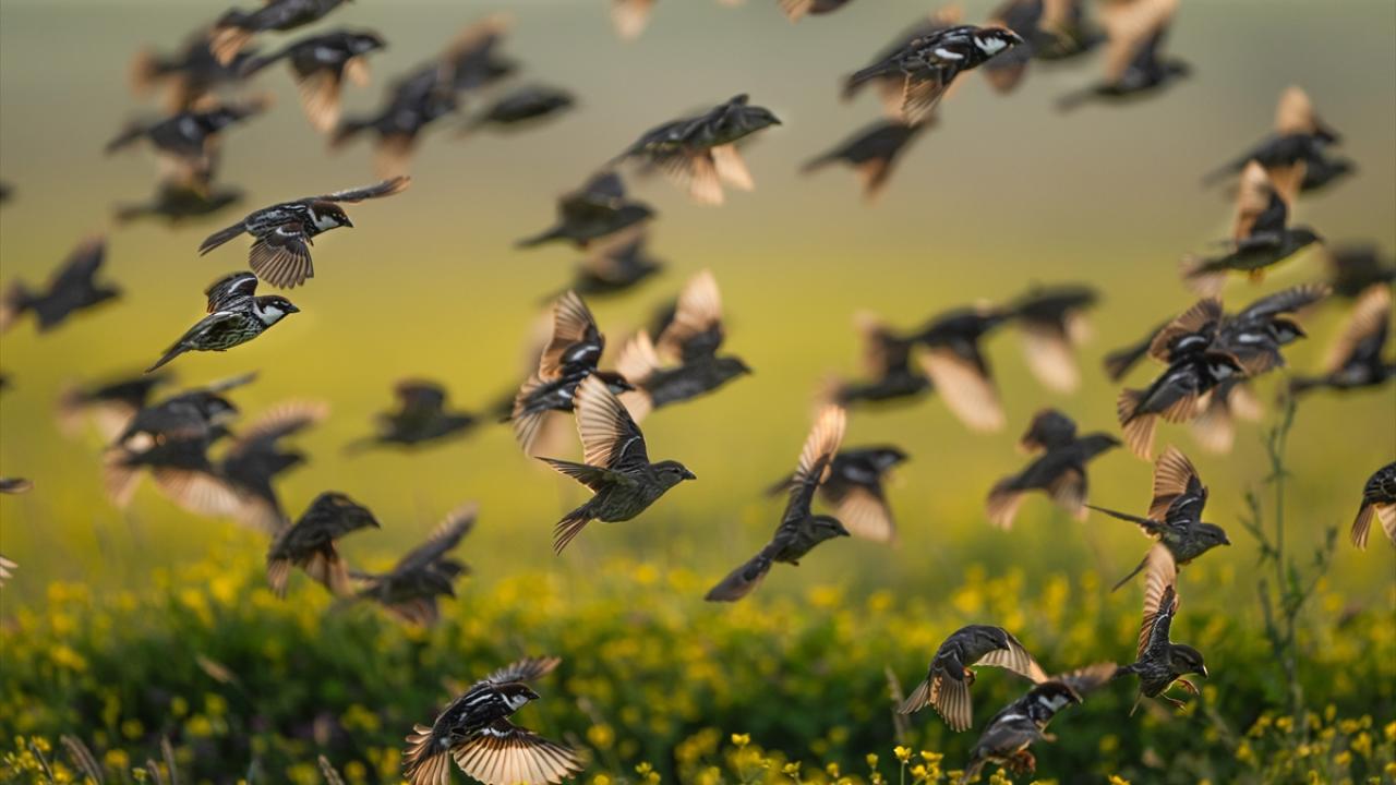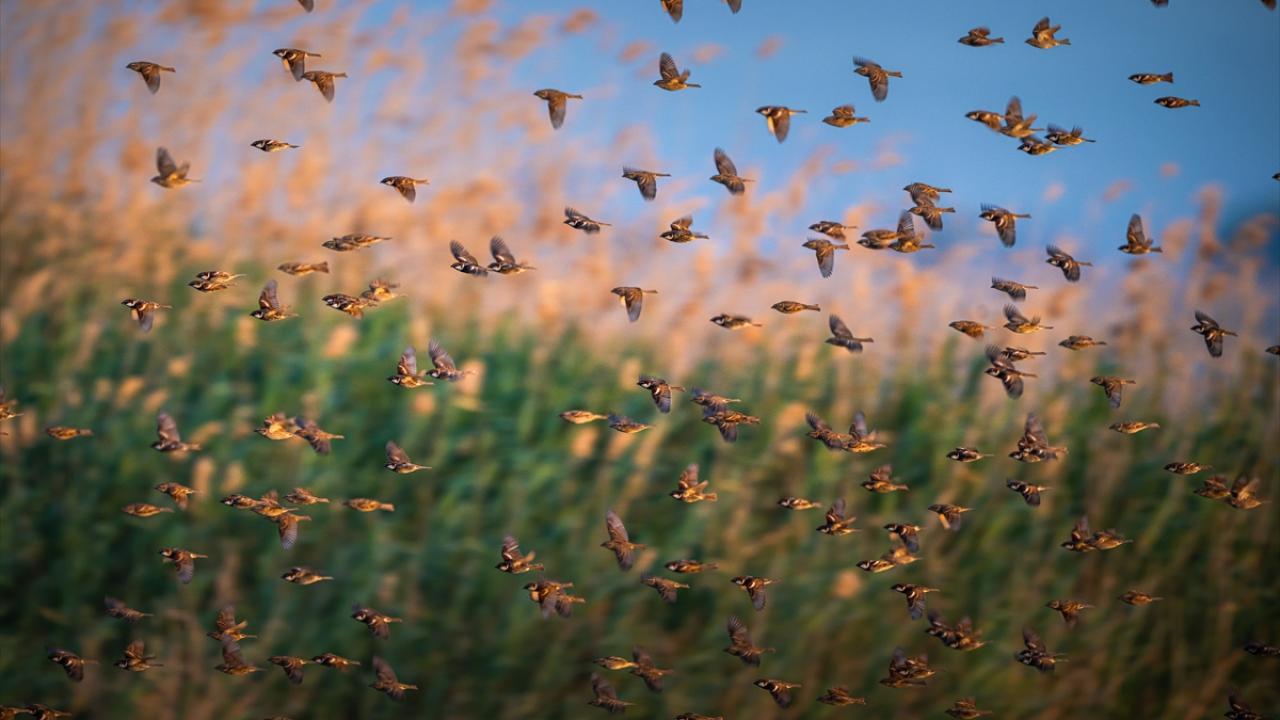 Sürü halinde uçuşan söğüt serçeleri doğayla bütünleşti