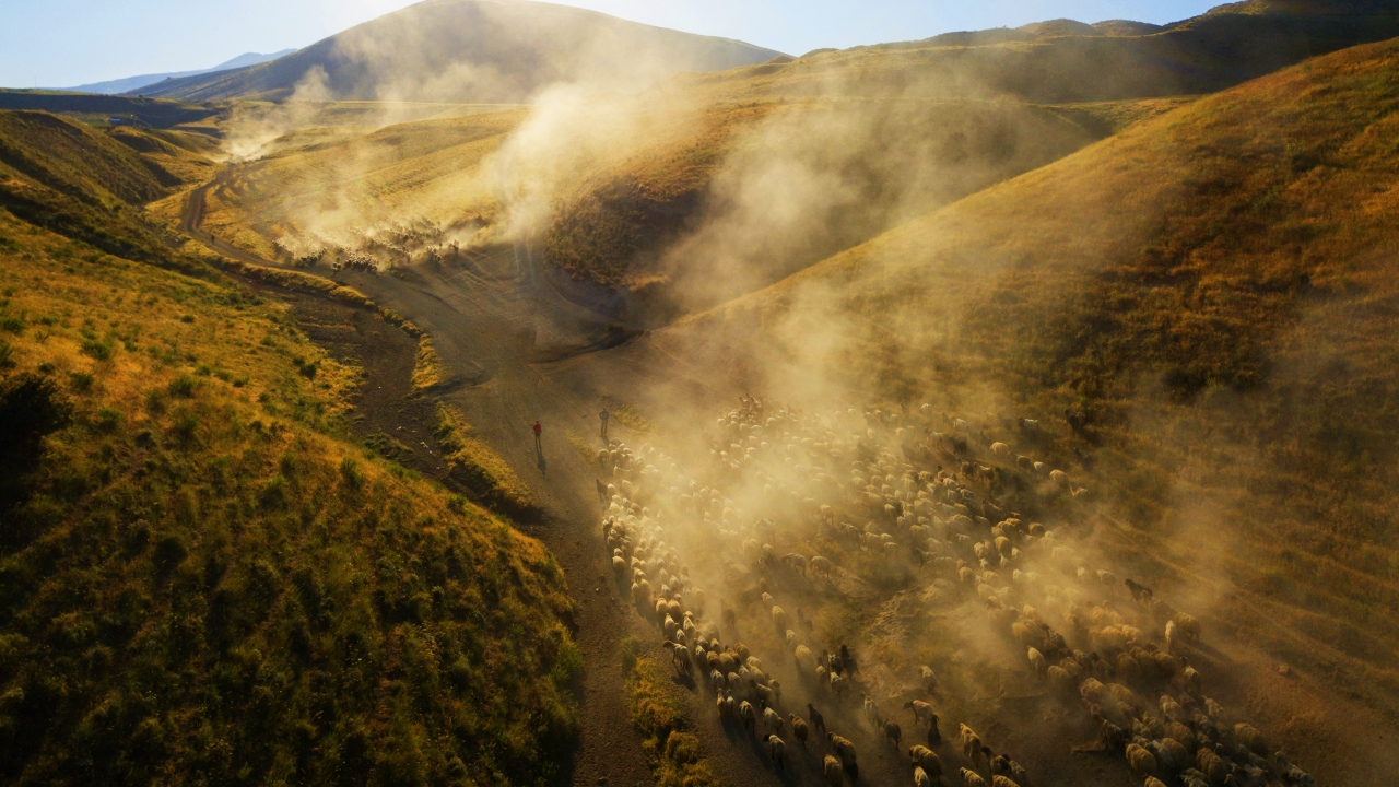 Koyun sürülerinin tozlu yolda ilerleyişi, çoban ve koyunları zorlarken gün batımına doğru oluşan kızıl renkler ise seyri doyumsuz görüntüler ortaya çıkarıyor.