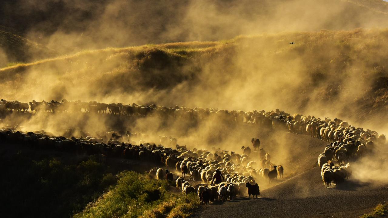 Koyun sürülerinin tozlu yolda ilerleyişi, çoban ve koyunları zorlarken gün batımına doğru oluşan kızıl renkler ise seyri doyumsuz görüntüler ortaya çıkarıyor.
