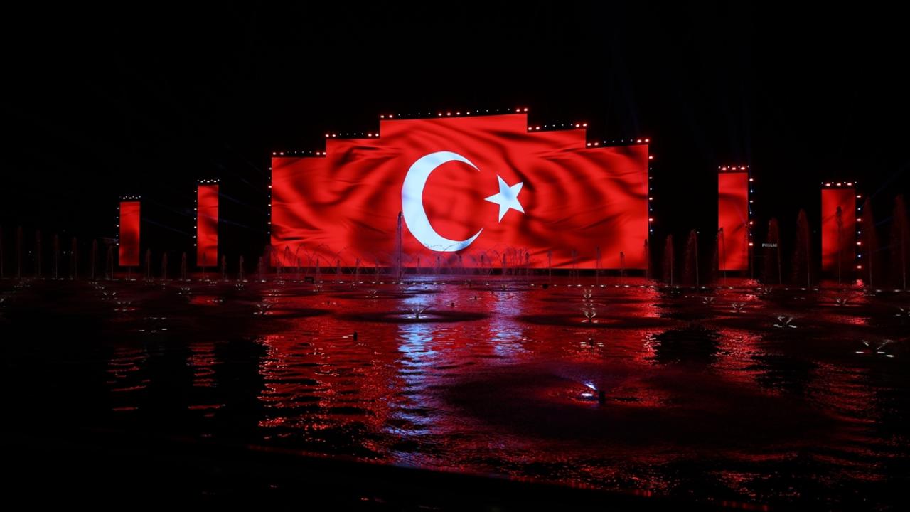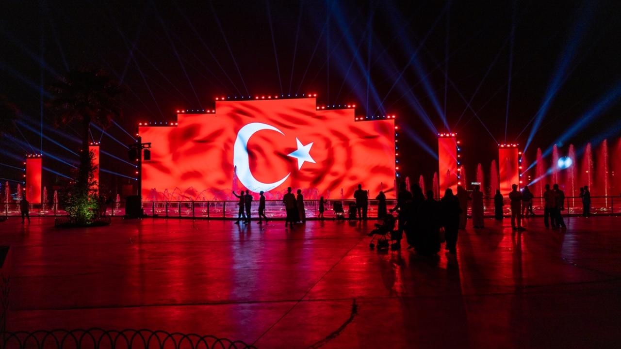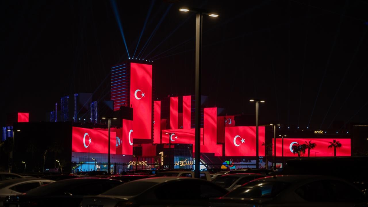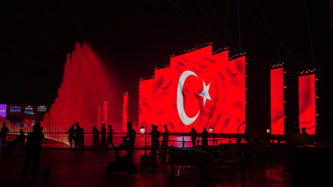 Suudi Arabistan'ın başkenti Riyad'daki festival alanı "Boulevard City"deki, ekranlar ve yapılar, Türkiye Cumhuriyeti'nin kuruluşunun 100. yılı dolayısıyla Türk bayrağıyla ışıklandırıldı.
