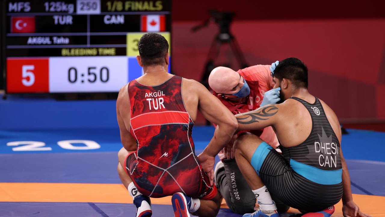 Makuhari Messe`de erkekler serbest stil 125 kiloda Kanadalı Amarveer Dhesi ile karşılaşan Taha Akgül, rakibi karşısında ilk yarıyı 3-0 önde geçti.