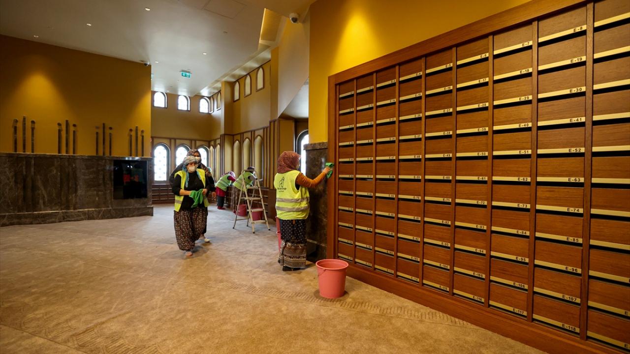 2 bin 482 metrekare arsa alanına, yaklaşık 16 bin 500 metrekare de inşaat alanına sahip caminin içerisindeki boyama işlemleri tamamlanırken, namaz alanındaki ahşap duvar kaplamaları ile camlara korkuluklar takıldı.