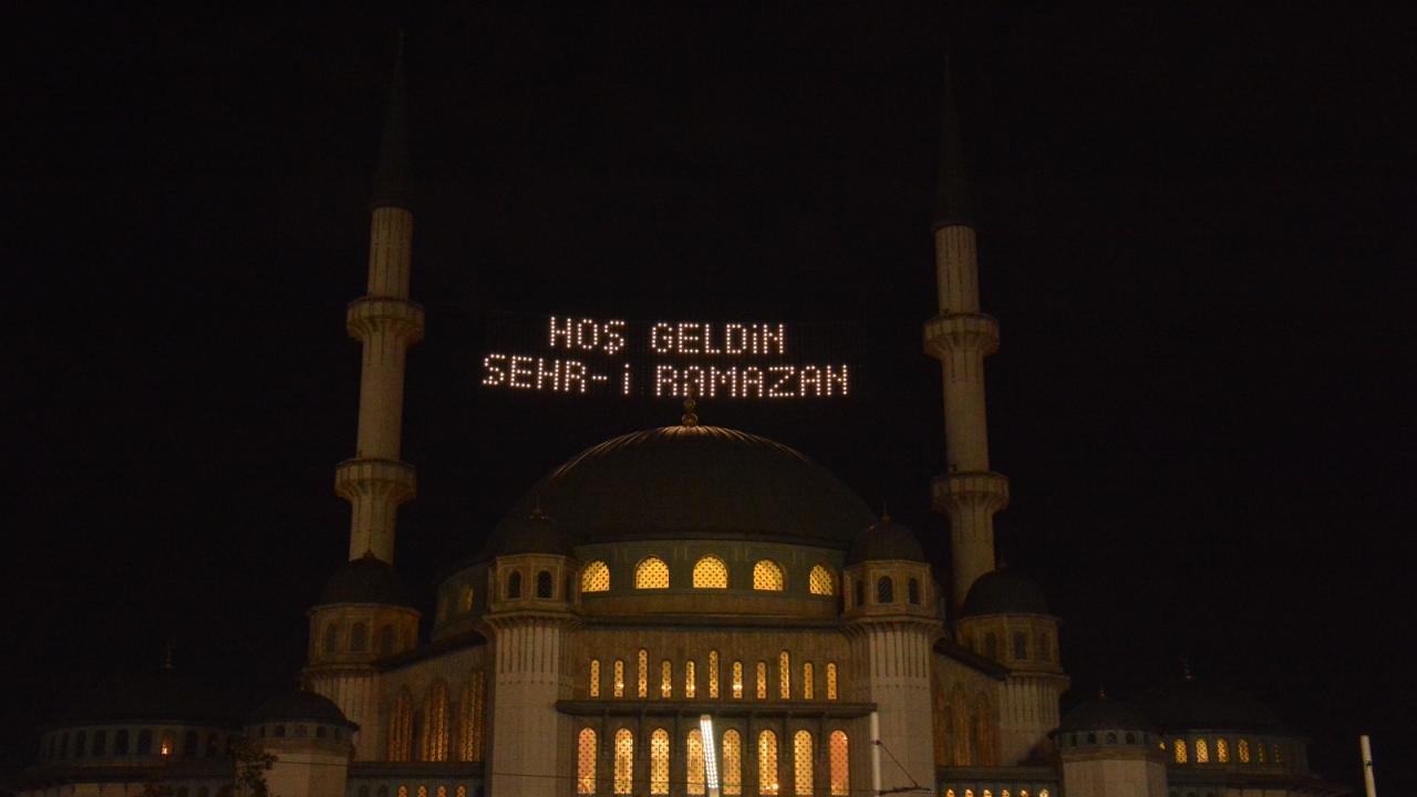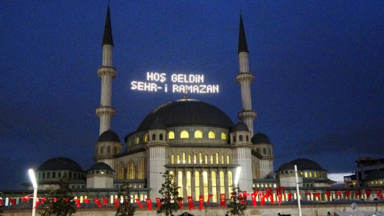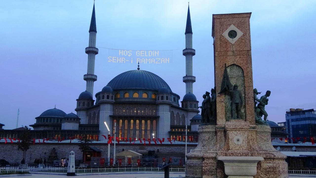 Açılışına kısa bir süre kalan Taksim Camii'nin minarelerine "Hoş Geldin Şehr-i Ramazan" yazılı mahya asıldı.