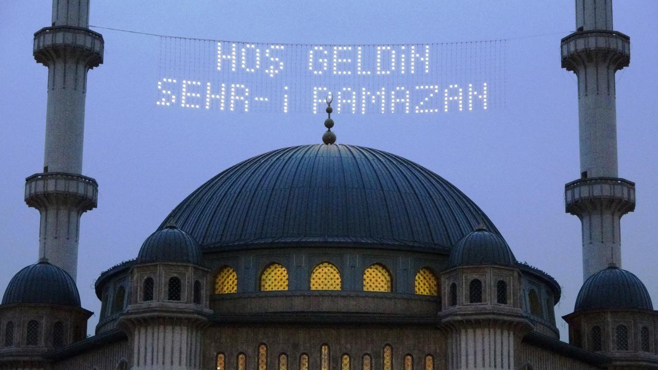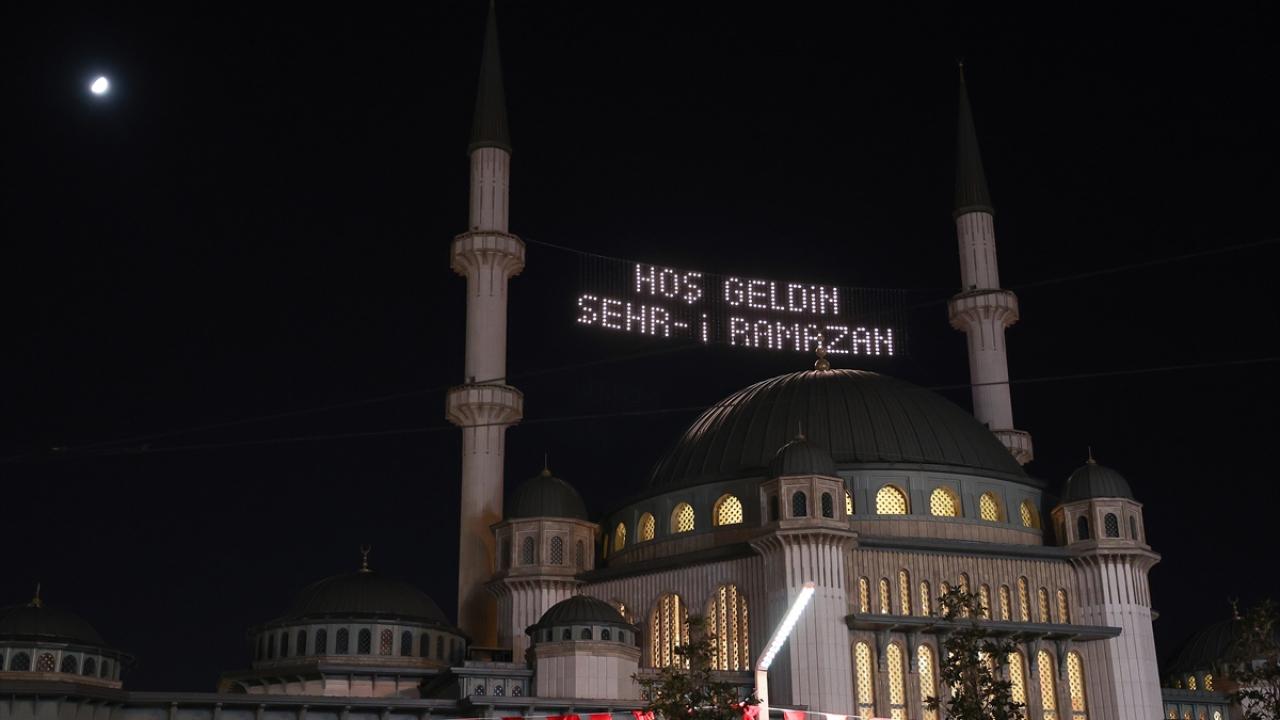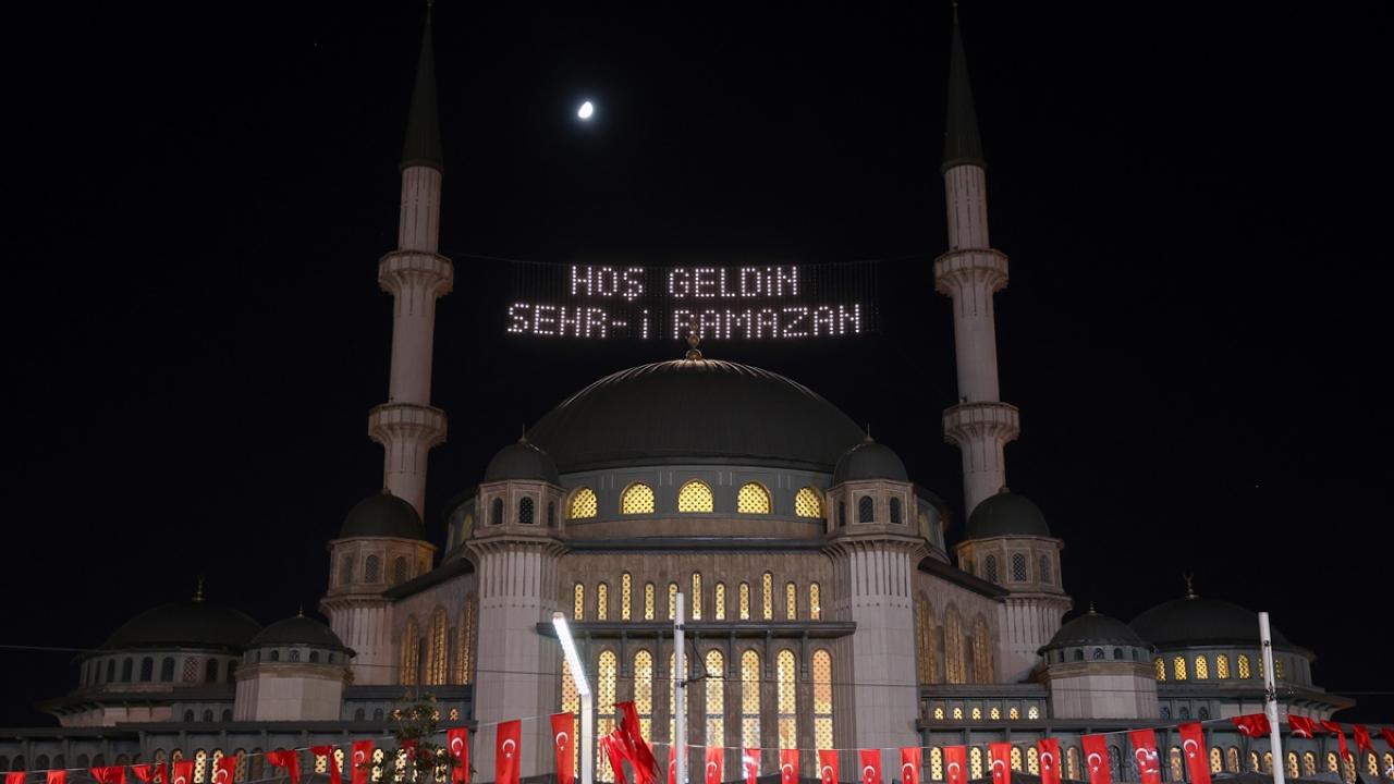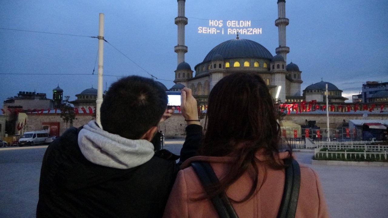 Açılışına kısa bir süre kalan Taksim Camii'nin minarelerine "Hoş Geldin Şehr-i Ramazan" yazılı mahya asıldı.