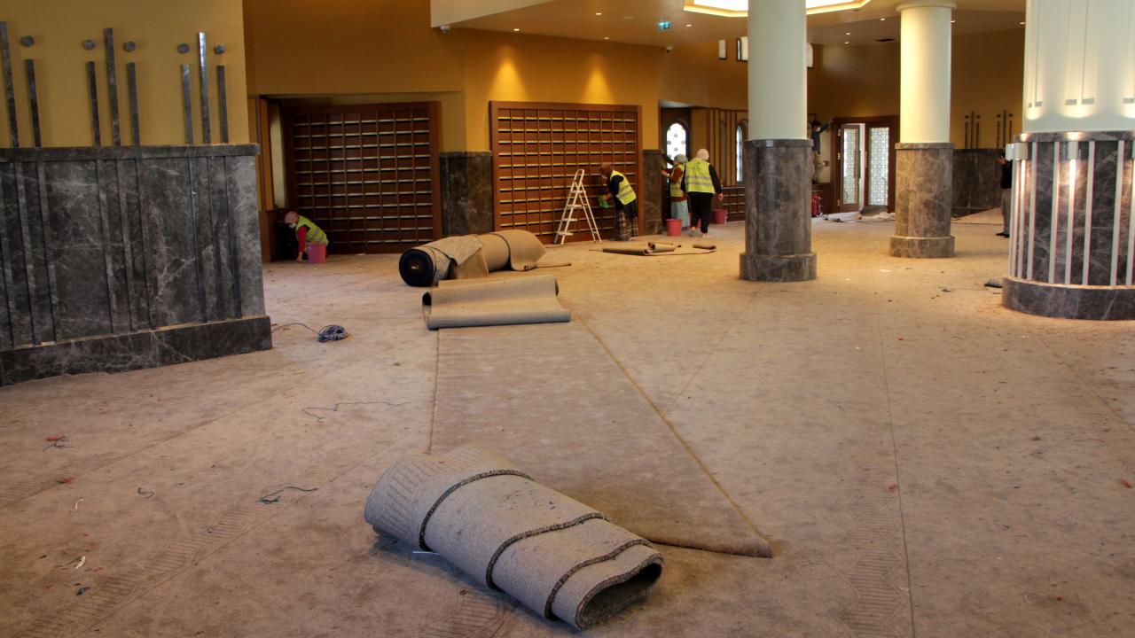 Yüzde 100 yün olan halılar, Manisa`da dokunduktan sonra İstanbul`a getirildi. Deve tüyü rengi halıları serme çalışmaları görüntülendi.